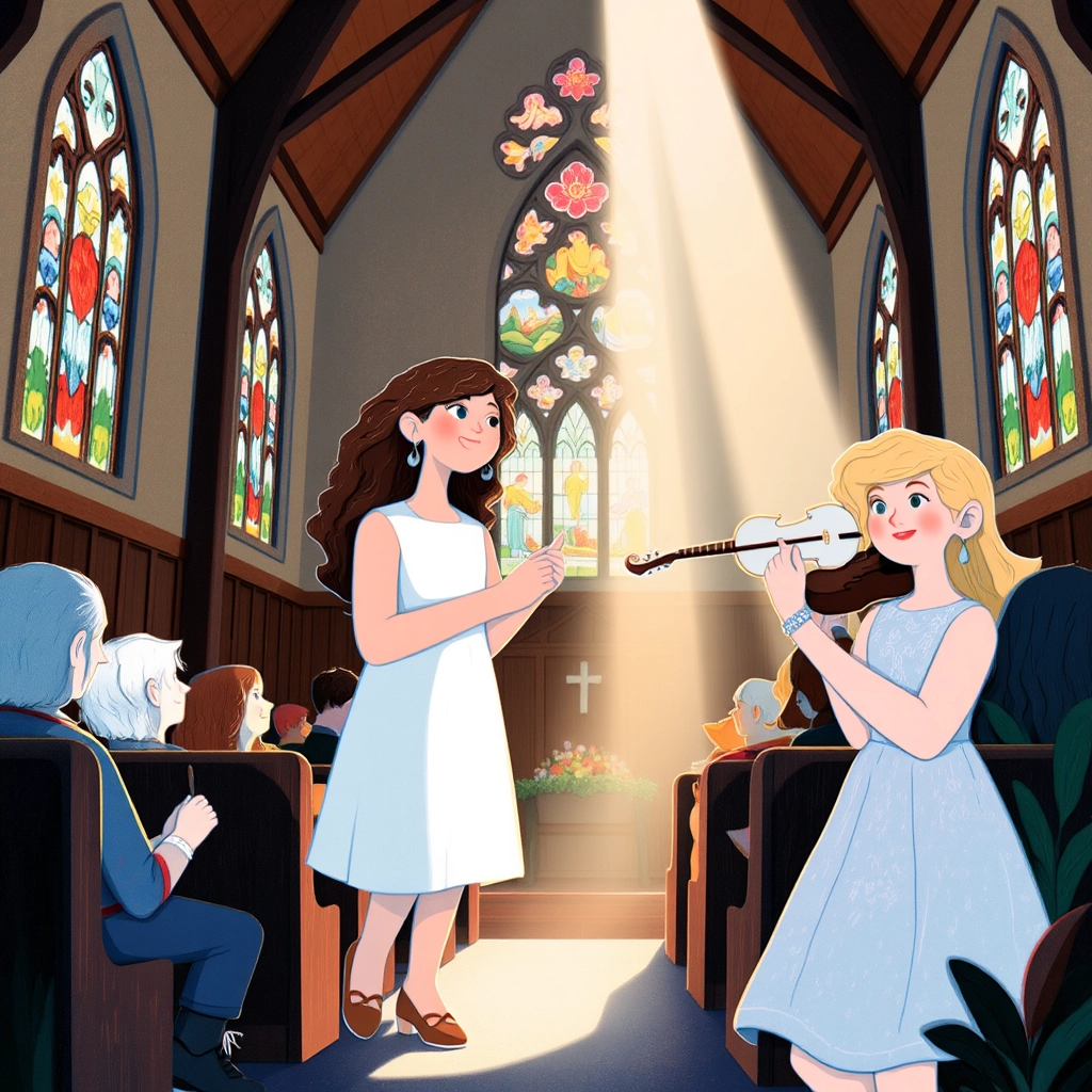 [Grace](DJTMRPXK) soon met [Hannah](XHKWGRN3), a girl who played the violin and volunteered at the church. 'Would you sing with me, [Grace](DJTMRPXK)?' asked [Hannah](XHKWGRN3). Together, their music brought cheer to people’s hearts during Sunday worship.