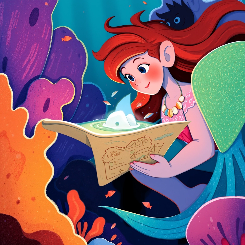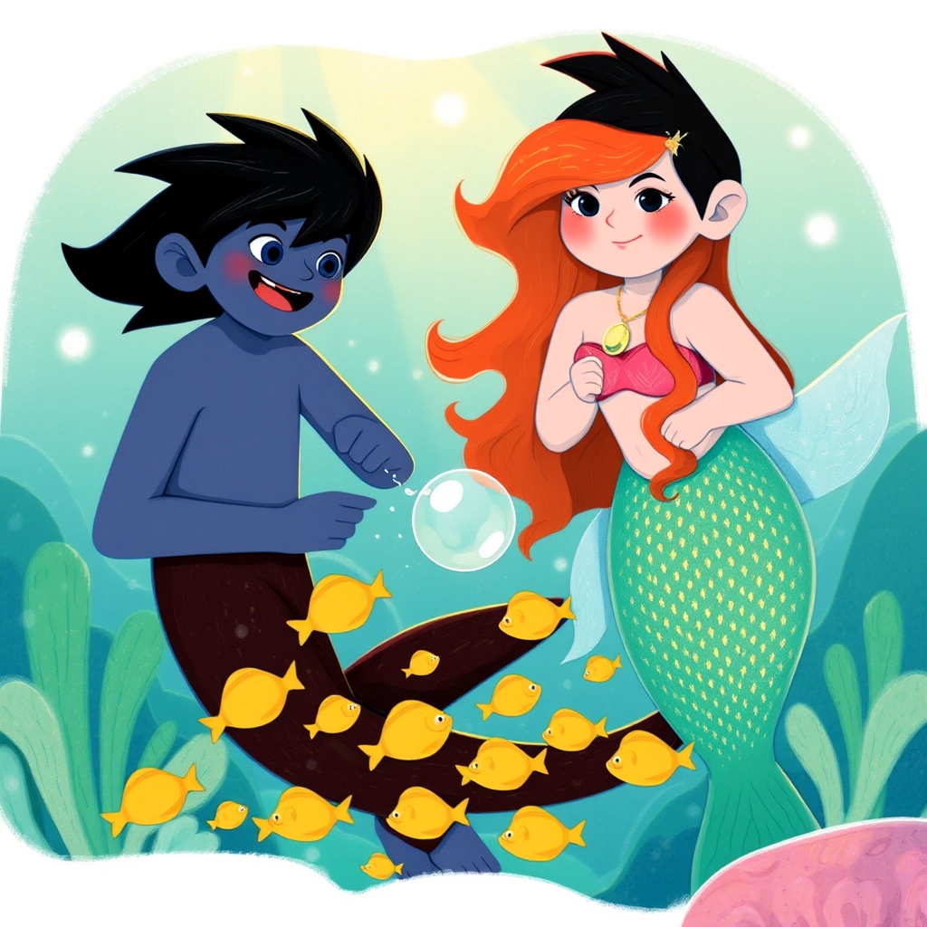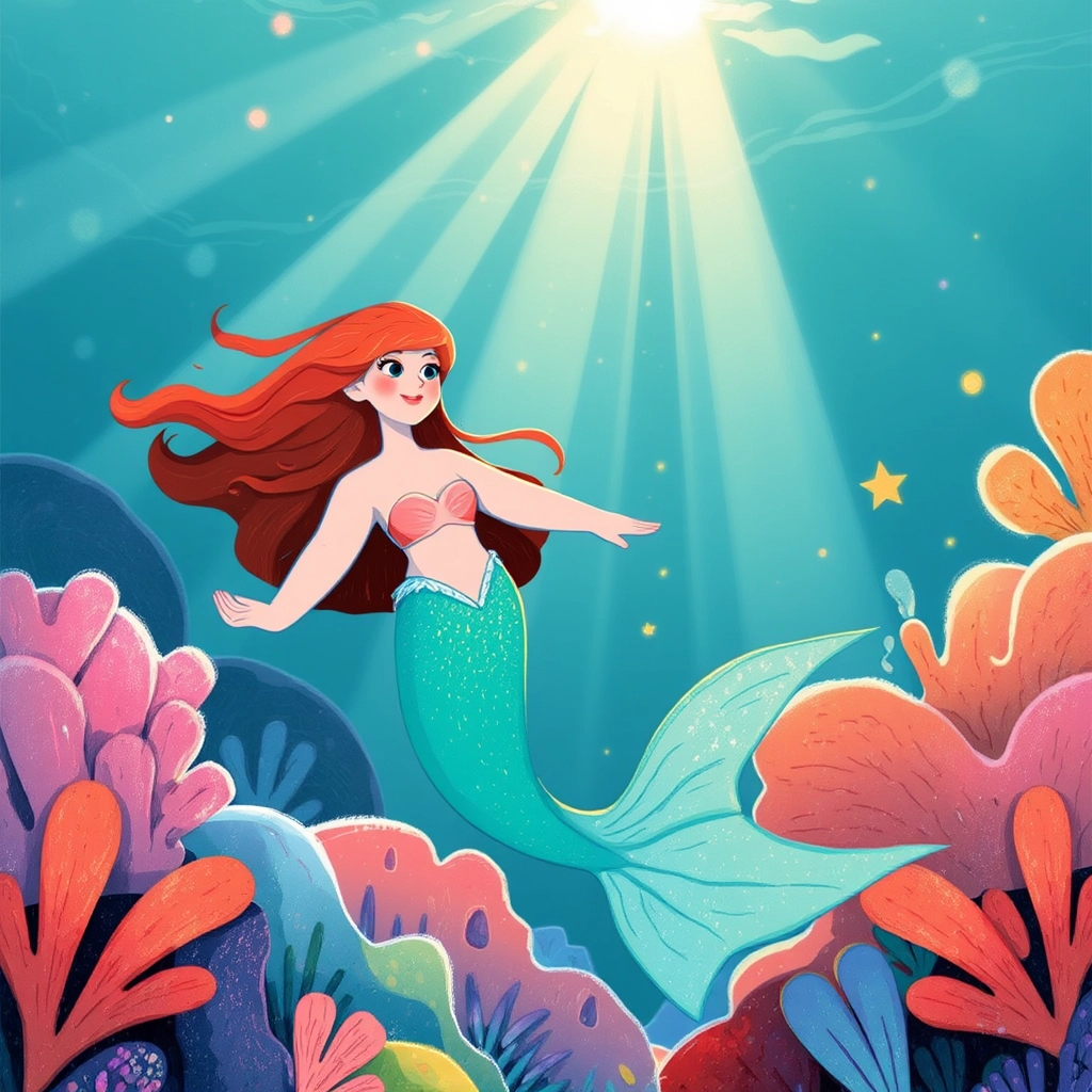 Once upon a time, deep in the shimmering blue ocean, lived a young mermaid named [Ginger](5S5V2X9P). At just nine years old, [Ginger](5S5V2X9P) was known for her kind heart and her beautiful, fiery red hair that flowed like seaweed in the current. She lived with her family in a coral reef filled with sparkling crystals and surrounded by curious, colorful fish.
