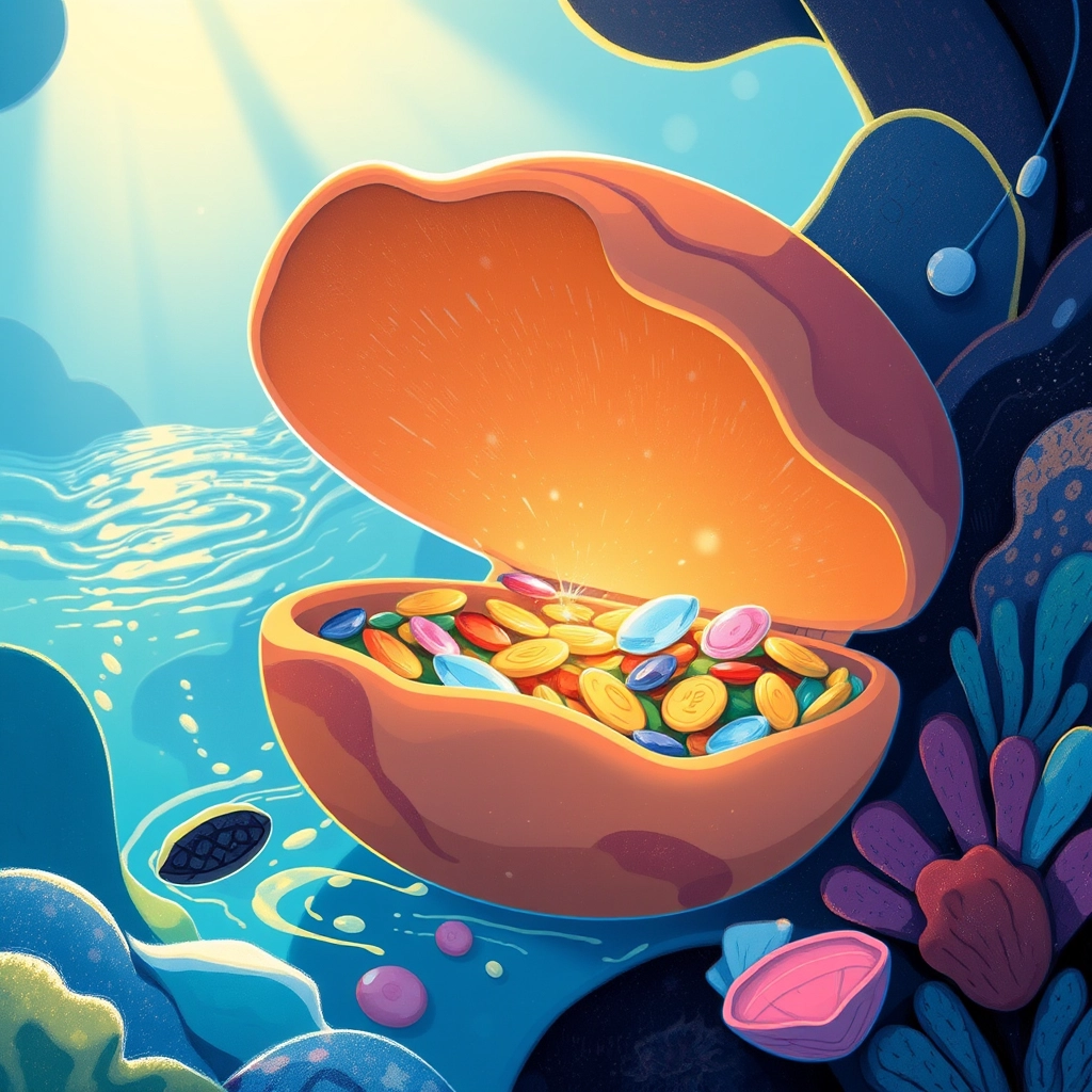 At last, they reached Lumina Lagoon. It was breathtaking! The water glowed in soft blues and greens, and golden light glittered from the sand below. A giant clam sat hidden behind a fan-shaped coral, slightly open with the treasure inside!