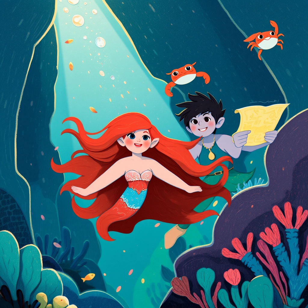 The siblings swam quickly, following the map’s glowing trail, weaving in and out of underwater canyons. Colorful crabs clicked their claws in greeting as [Ginger](5S5V2X9P) and [Serabin](CY2WR4ZV) passed by, determined to find the treasure.