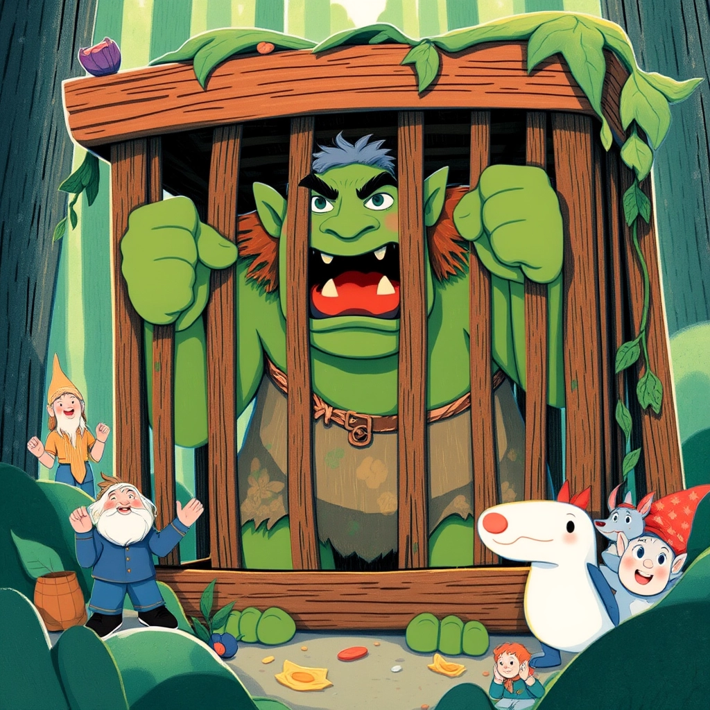 While Lucy led the ogre to the trap, the animals and gnomes worked together. With Barney’s logs and some clever knots, they built a sturdy cage hidden under branches.