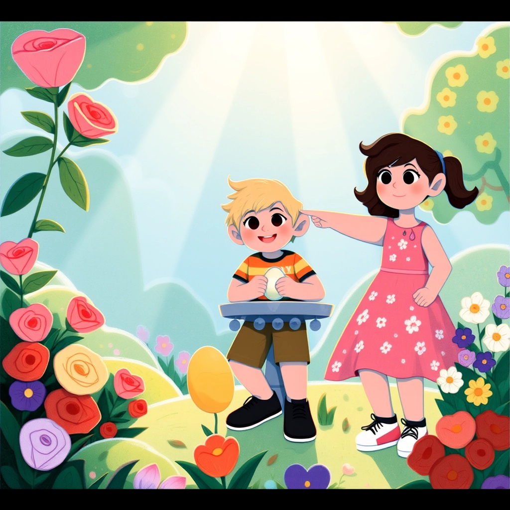 The children raced into the garden! 'Look!' shouted [Dylan](6GZRRKSY). He found a sparkling, golden egg hidden under a rose bush. Meanwhile, [Lila](J2FXFVT3) spotted a silver egg tucked behind the birdbath.