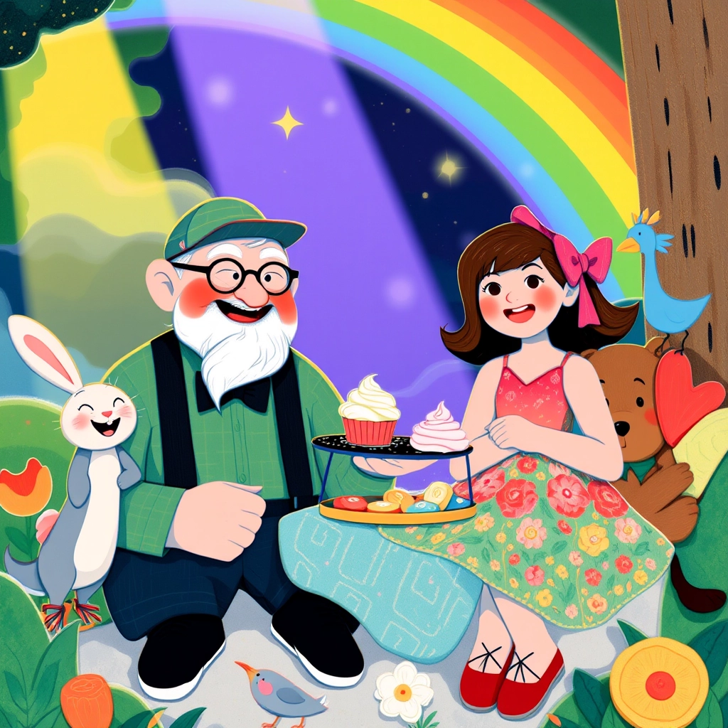 With a flash of light, [Emmy](SG9WJY5G)'s wish came true: they were surrounded by her favorite animals, who joined them for a picnic under the rainbow.