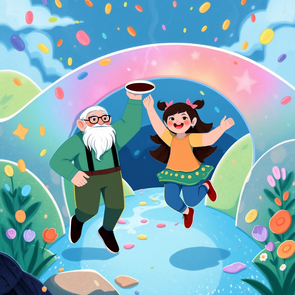Following the map, they crossed a shimmering bridge made of candy, laughing as jellybeans rained from above.