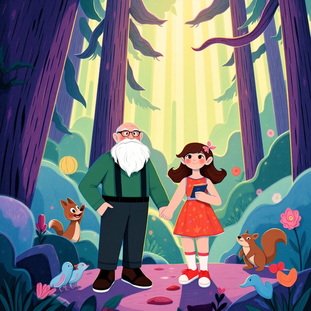 With a sprinkle of sparkling dust from the butterfly's wings, [Emmy](SG9WJY5G) and [Grandpa](WQMG6W4B) were whisked away to an enchanting forest filled with talking animals.