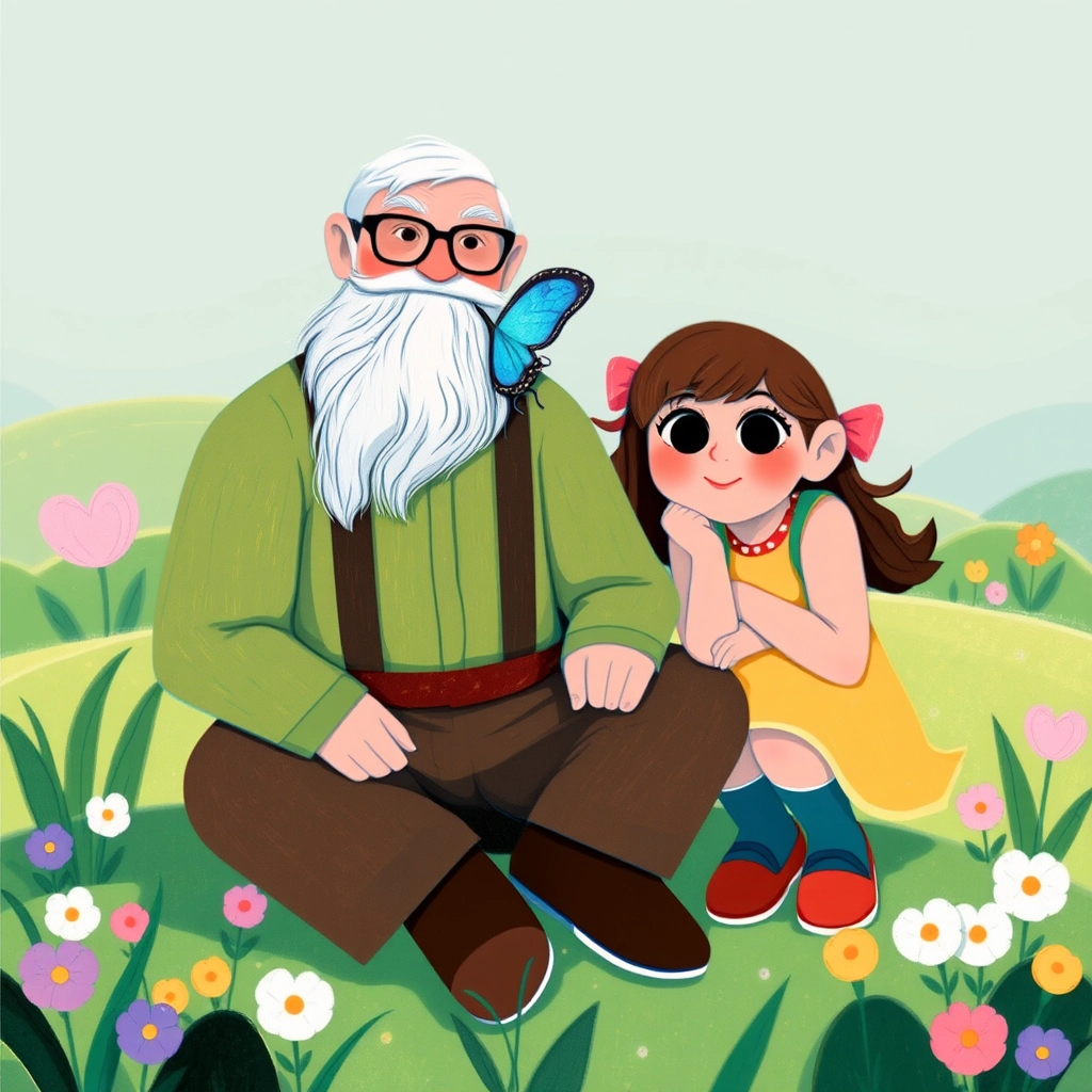 One day, [Emmy](SG9WJY5G) saw a sparkling blue butterfly land on [Grandpa](WQMG6W4B)'s shoulder and whispered, '[Grandpa](WQMG6W4B), is that butterfly magic?'