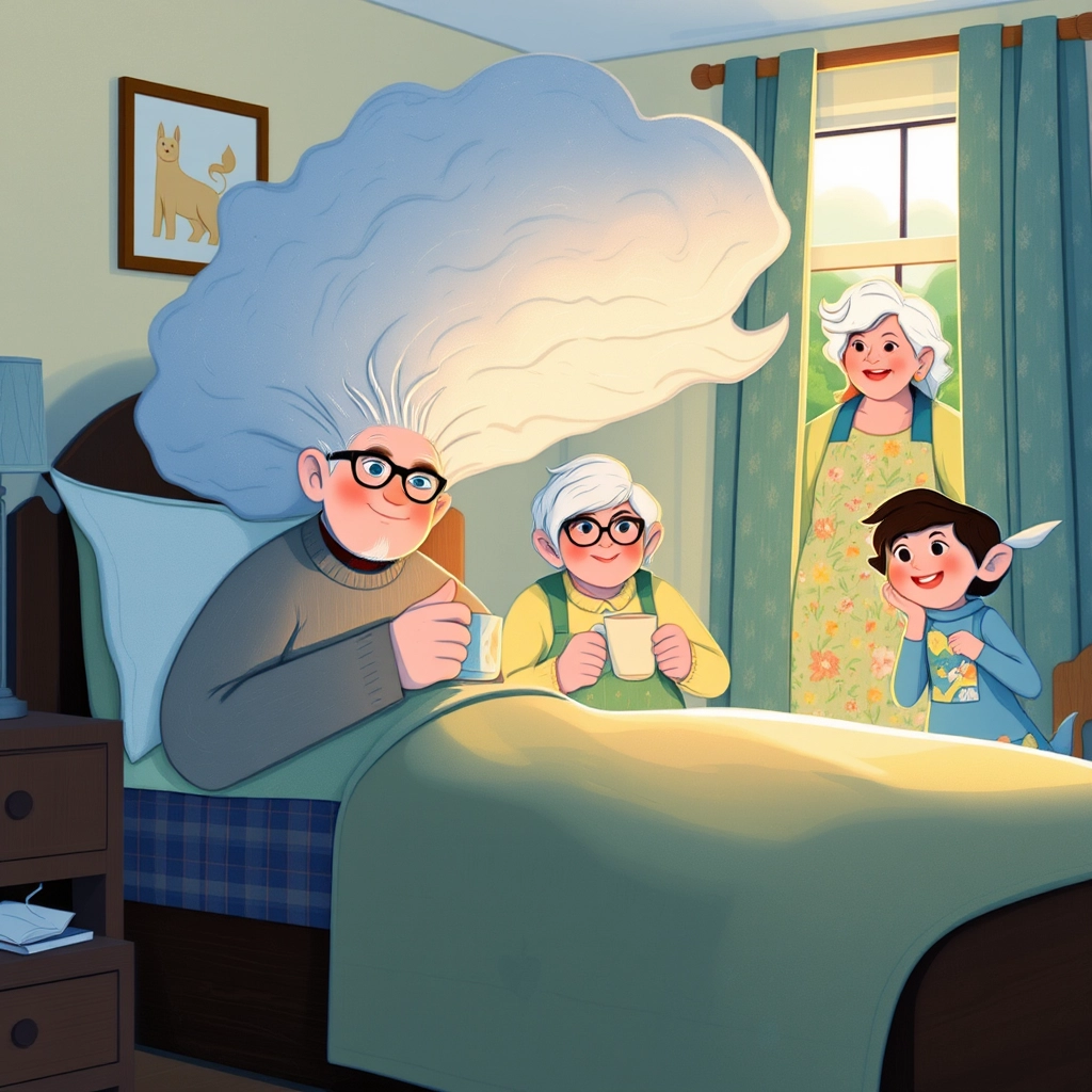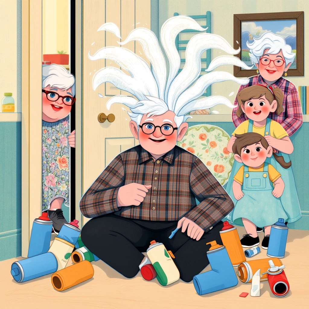 [Grandpa](LCP9B9RH) was the nicest, cutest man with silvery-gray, beautifully styled hair. But one morning, he woke up, and oh no! His hair was big, poofy, and out of control! [Grandma](V33J2L25) and his granddaughter gasped in surprise—they had NEVER seen [Grandpa](LCP9B9RH)'s hair this poofy, ever, ever, ever!