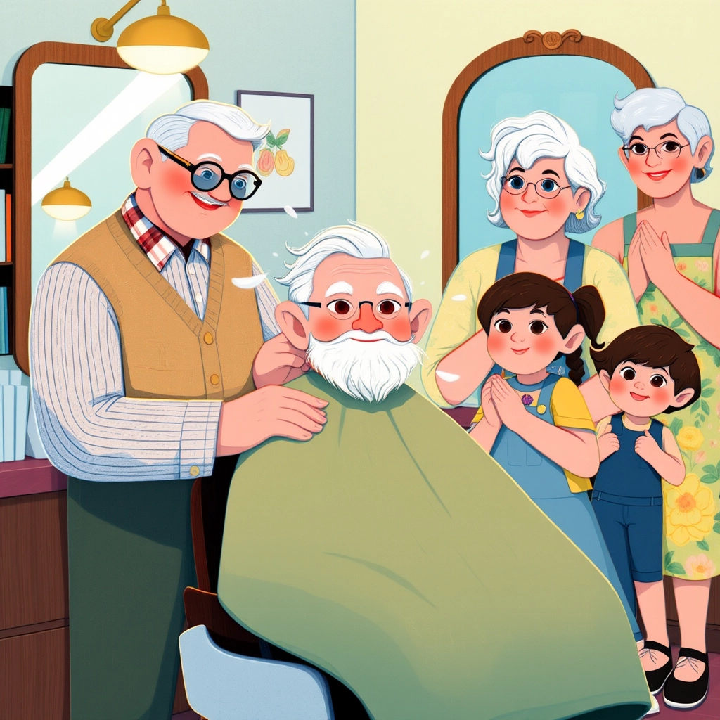 Everyone was happy—[Grandpa](LCP9B9RH), [Grandma](V33J2L25), and the granddaughter. [Grandpa](LCP9B9RH) looked cute again, even though he was bald. In fact, he loved his new look! No more trouble with poofy hair EVER again!