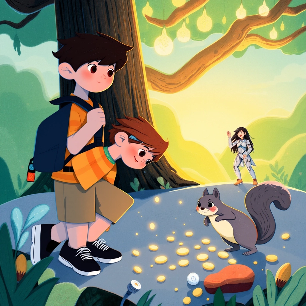 Suddenly, they heard a rustling in the bushes. Out popped a friendly squirrel holding an acorn! It nodded as if to welcome them into the forest.