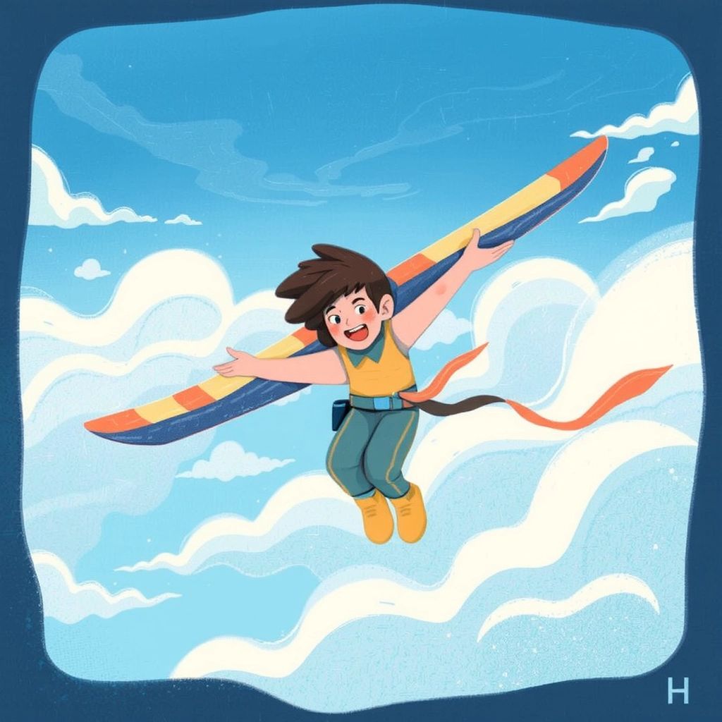 The journey continued through fluffy clouds and bright blue skies. [H](Z59W7BNJ) felt a rush of wind and excitement, knowing this was just the beginning of many more adventures.