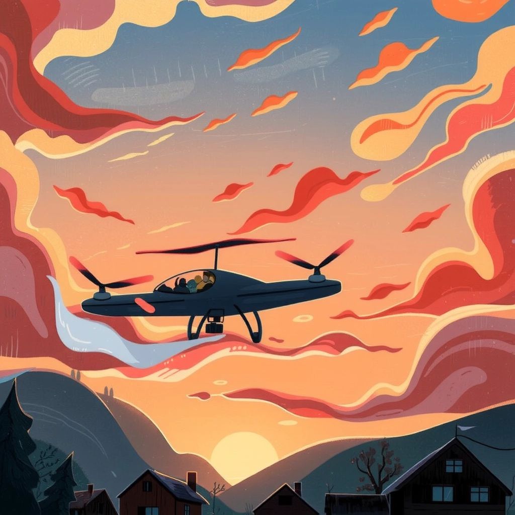 As the sun began to set, painting the sky with shades of orange and pink, [H](Z59W7BNJ) decided it was time to head back. Reluctantly, the machine descended slowly towards the village, leaving behind the adventures of the sky.