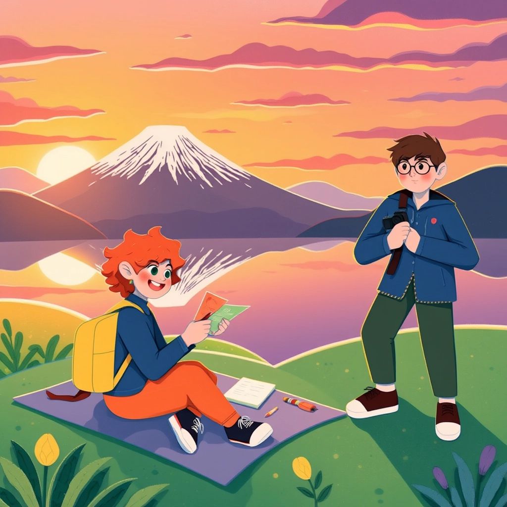 As the sun set, they arrived at Mount Fuji to watch the glowing orange sky and its reflection on a serene lake. [Philip](GM57YRB5) took photos of the mountain, while [Hadley](9LC65H7Y) wrote postcards to remember the magical day.
