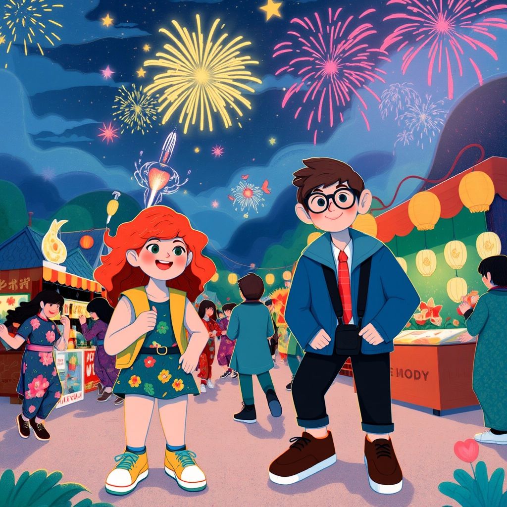 To end their journey, they watched a festival with dancers and fireworks in Osaka. Colorful yukatas, happy families, and the festive beats made it unforgettable. 'Japan is amazing!' they both agreed.