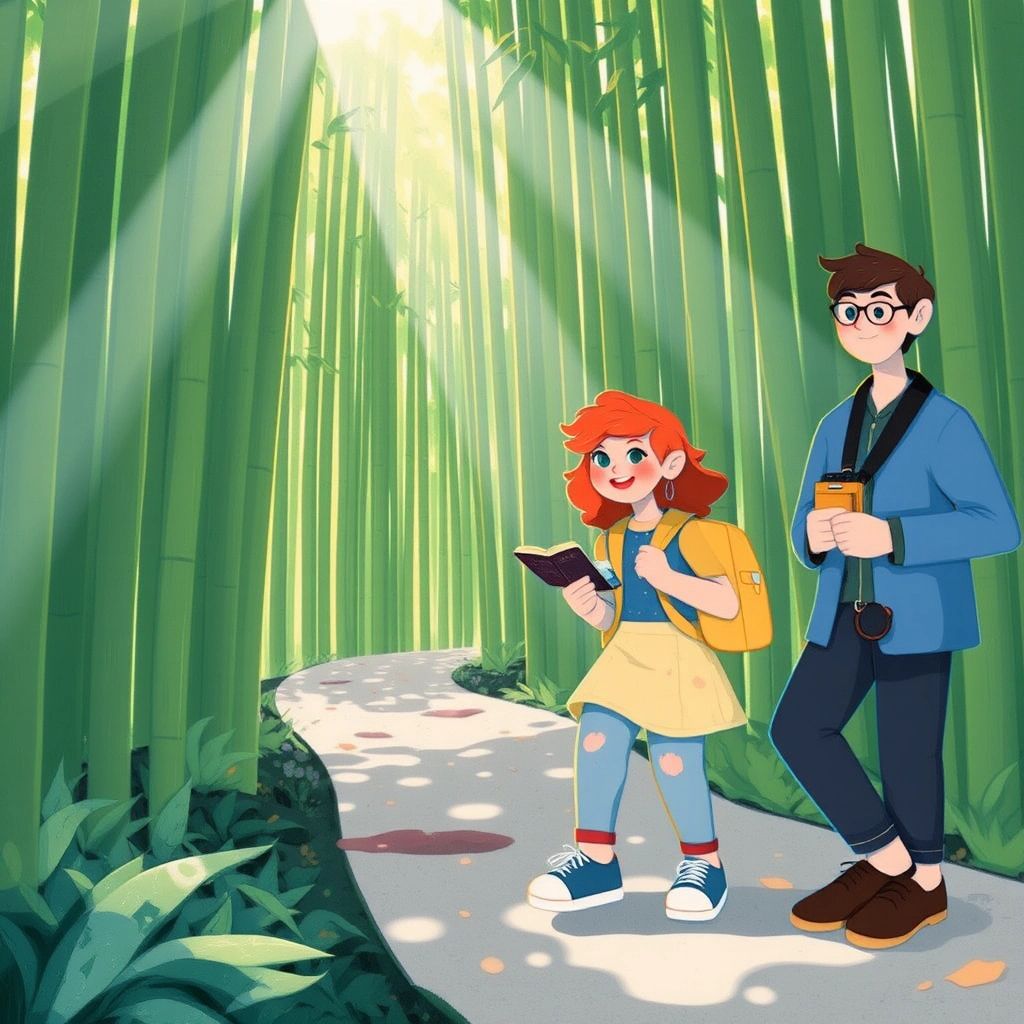 The next day, they found themselves in a tranquil bamboo forest in Kyoto. The soft rustling of the tall green stalks and the gentle sunlight filtering through made it feel magical. 'It’s like another world!' whispered [Hadley](9LC65H7Y).