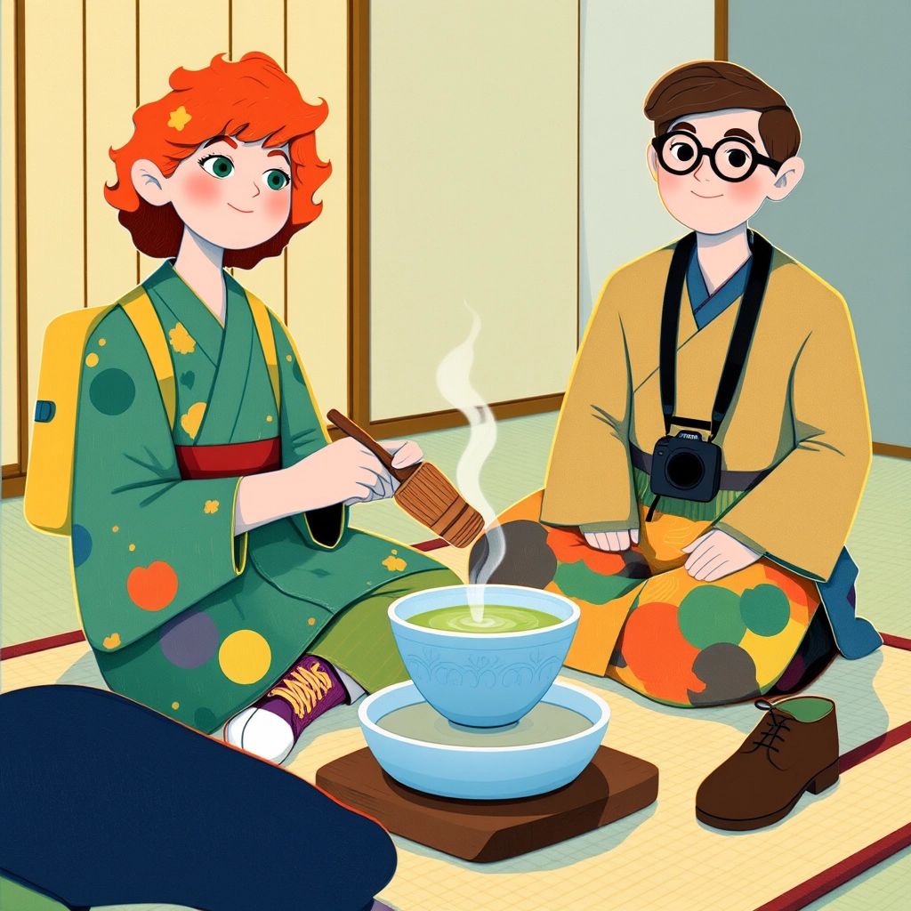 Later, they wore traditional kimonos and attended a tea ceremony. The tea master showed them how to prepare Matcha tea with slow, graceful movements. It was a quiet moment of calm and beauty.