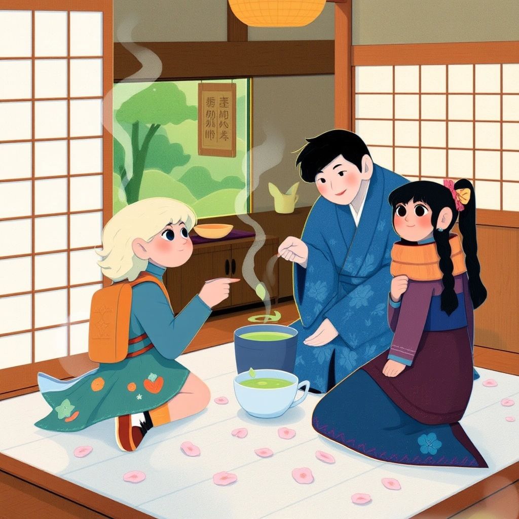 In the evening, they attended a traditional tea ceremony. [Hadley](2FQRM7BW) learned to sit respectfully on her knees and sipped the matcha tea carefully.