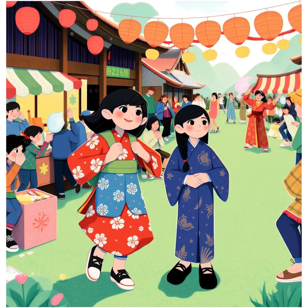 The next day, under the warm sun, they dressed up in colorful yukatas for a festival. [Hadley](2FQRM7BW) couldn’t stop twirling in her bright red and white floral outfit.