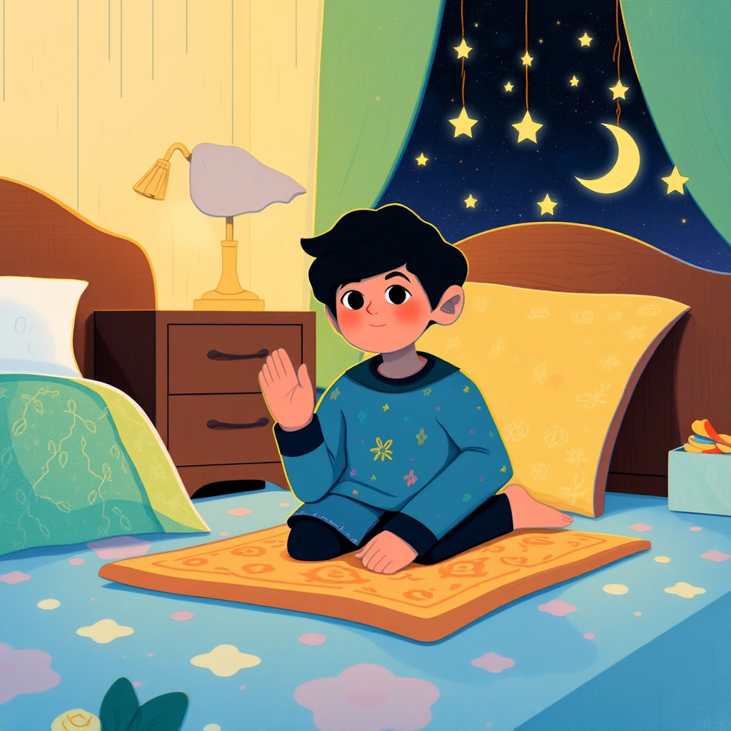 One night, [Yusuf](G95TMJSD) knelt beside his bed and raised his hands to Allah in prayer. 'Dear Allah, thank You for my hands. Please help me use them for kindness and good deeds,' he whispered.