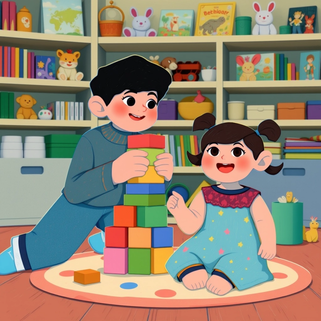 Later, at home, [Yusuf](G95TMJSD) helped his little sister build a tower from blocks instead of knocking it down. She clapped her hands with joy!