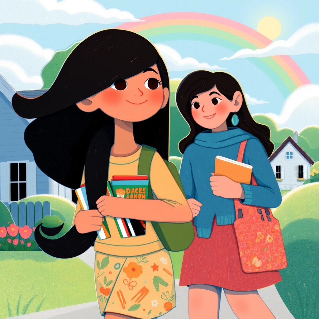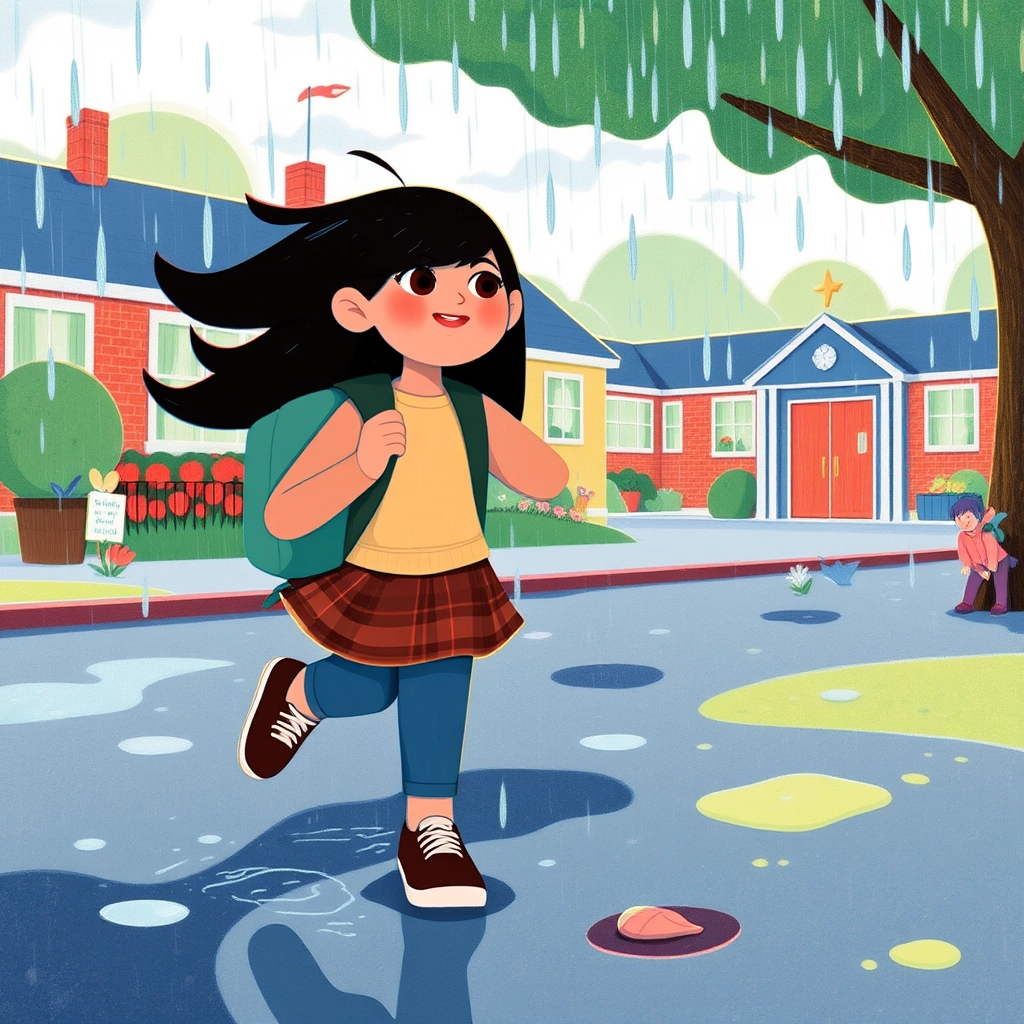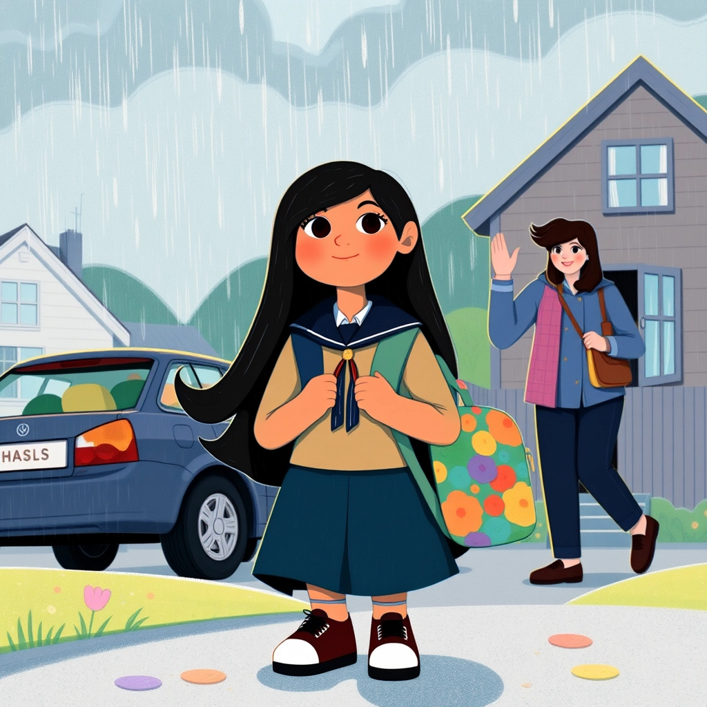 One day, [Hannah](F7LCWPNM) was heading to school on a rainy morning. With her big school bag on her back, she said goodbye to her mom in the parking lot.