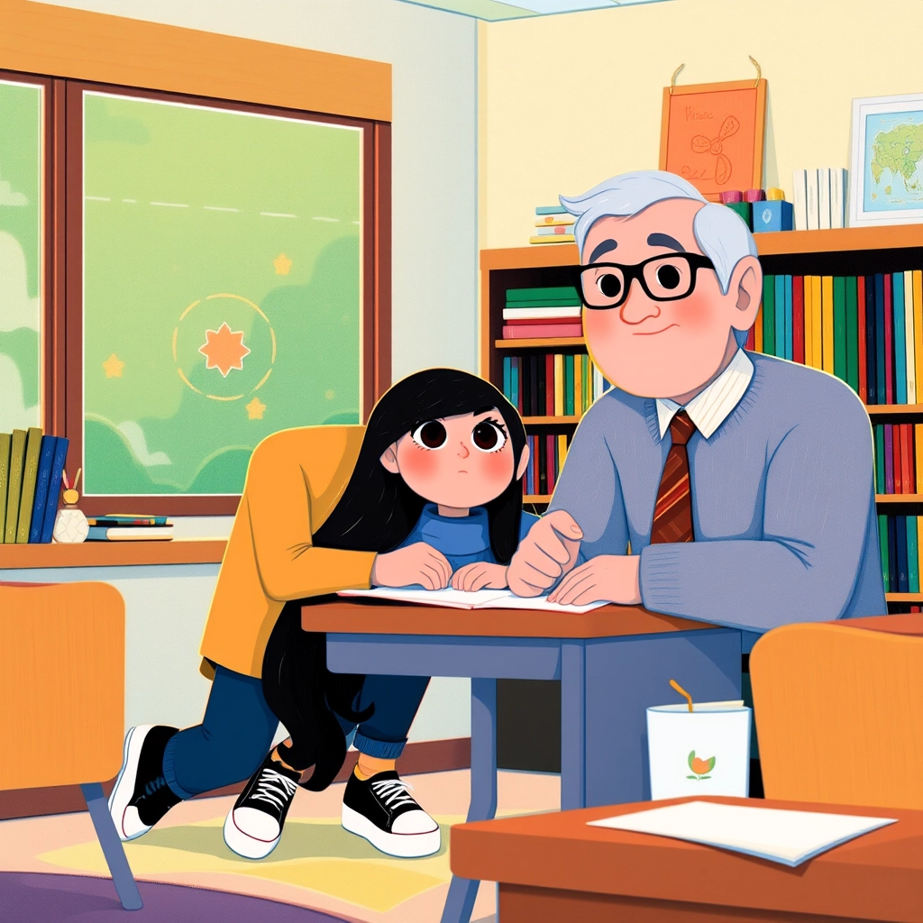 [Mr. West](9JMP5MMS) reached the classroom behind [Hannah](F7LCWPNM), who was sitting at her desk looking scared. She thought her books might be wet!