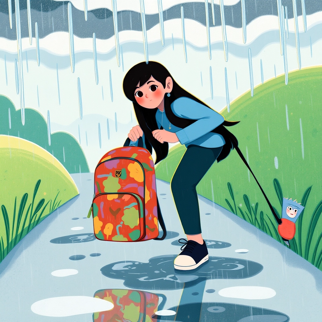 Suddenly, [Hannah](F7LCWPNM)’s heavy school bag slipped off her shoulder and fell onto the ground. She gasped and picked it up, feeling nervous about her books possibly getting wet.