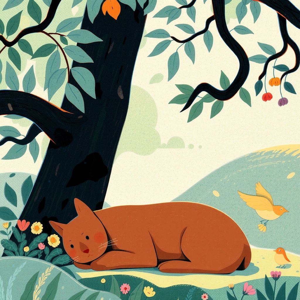 The zoomies are fading, his energy spent, Henry's in search of a sweet, leafy scent. He sniffs the air, basking in the breeze, finding a nap spot beneath the trees.