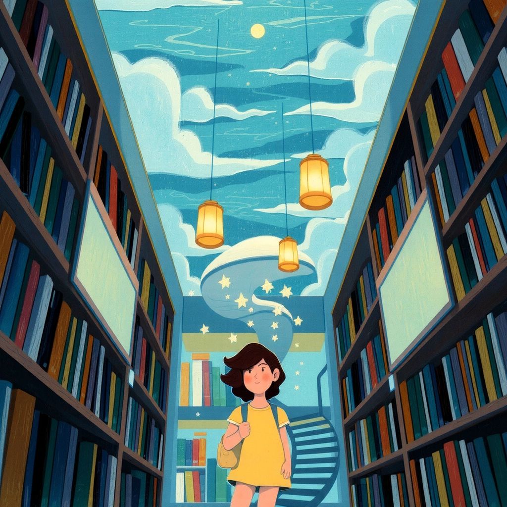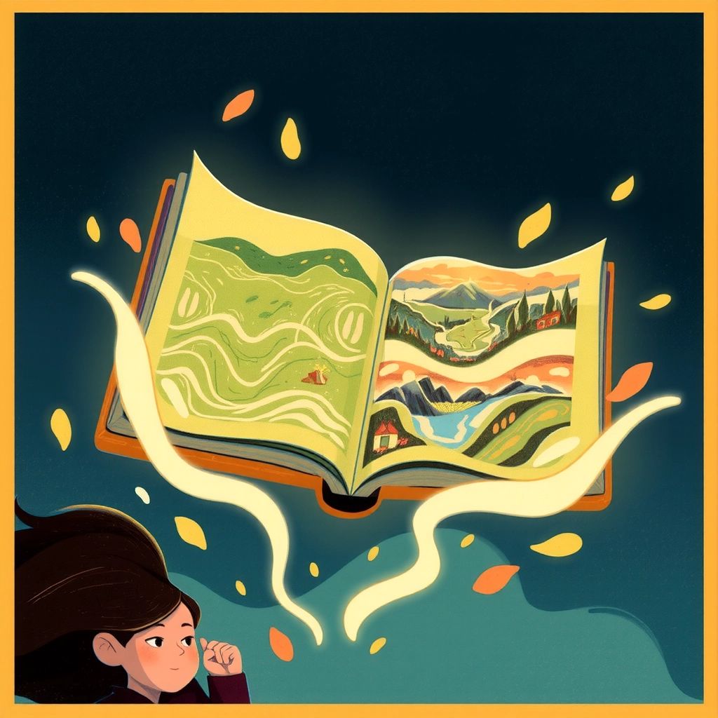 One book fluttered off the shelf and opened before her eyes. Its pages turned quickly, showing an illustrated map of far-off lands and enchanted forests.