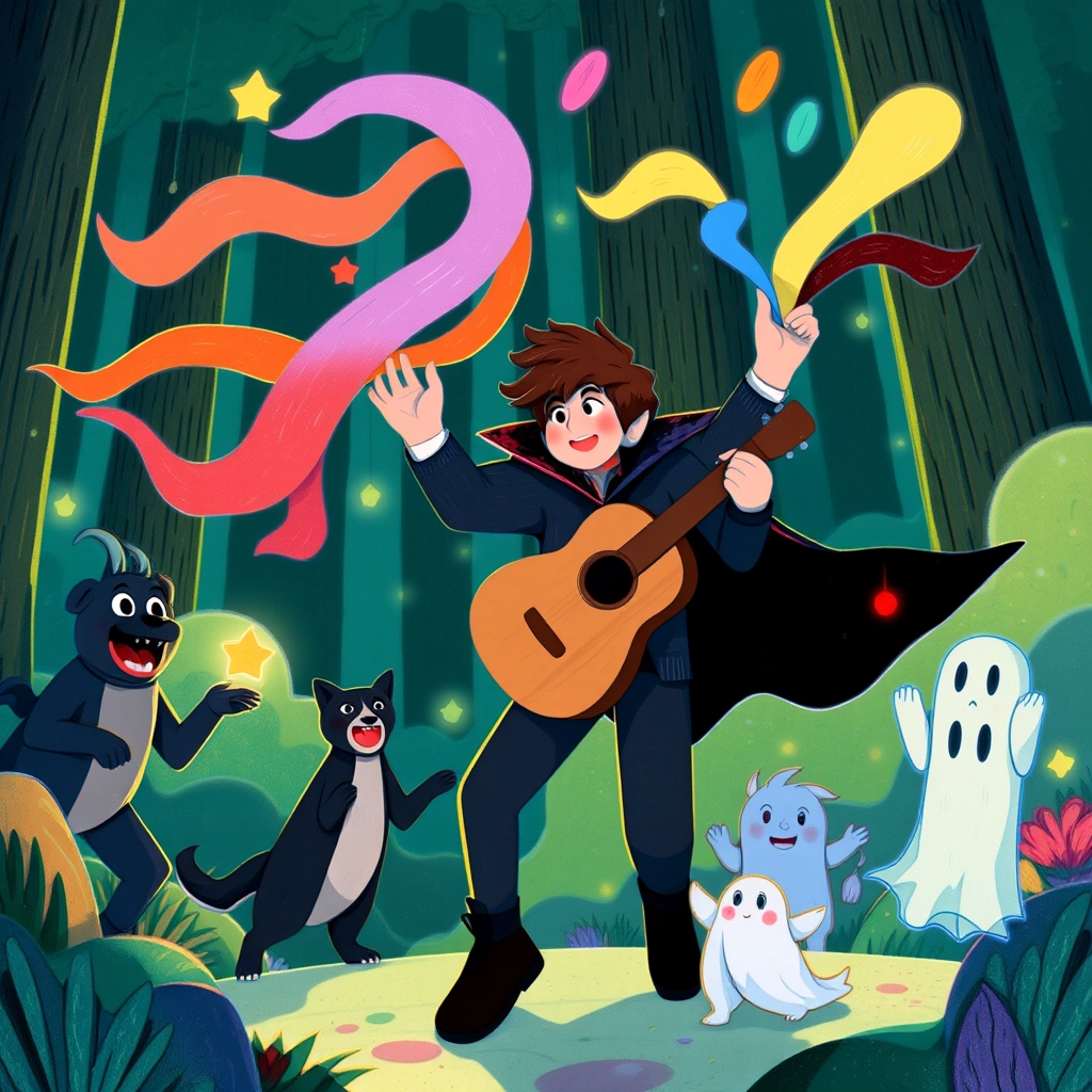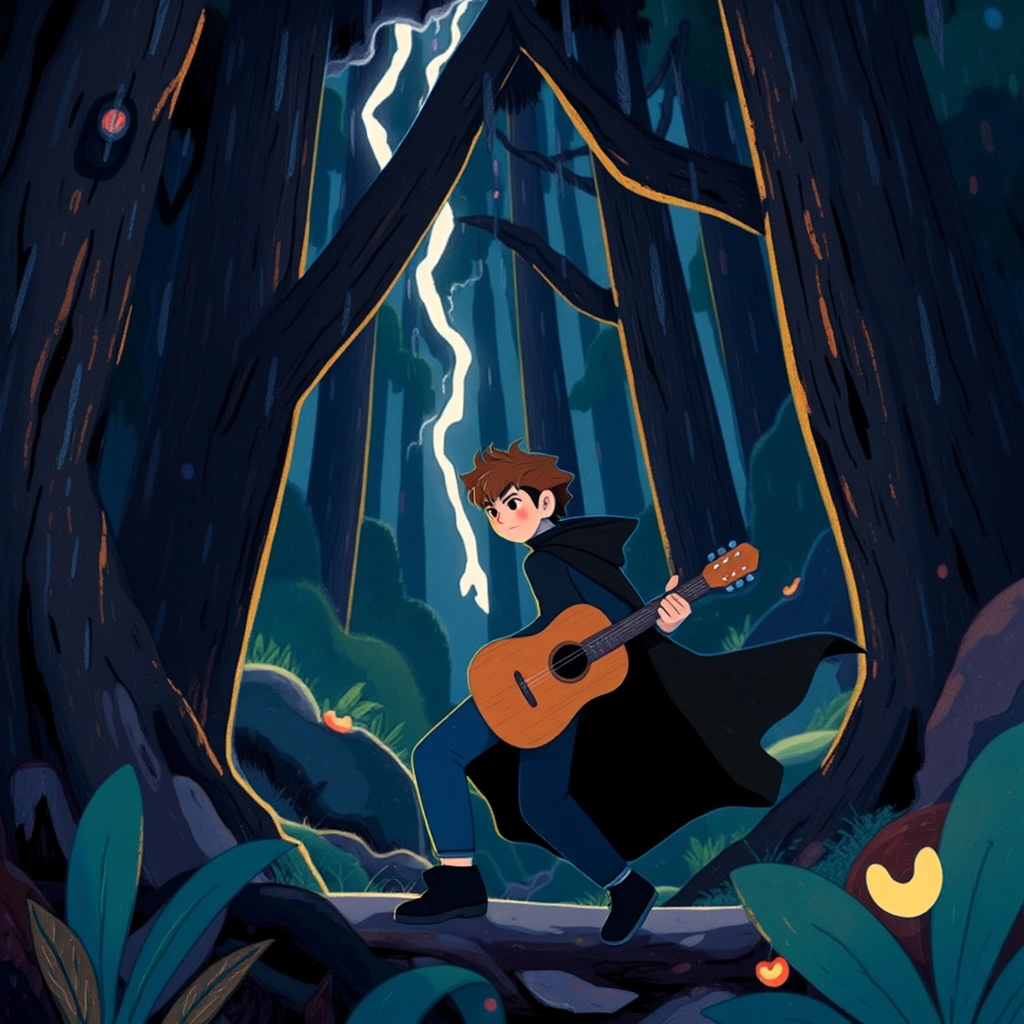 One stormy night, [Hobart](9QWXXFTB) couldn't resist an adventure. Raindrops drummed on the castle windows as he grabbed his guitar, threw on his trusty cape, and stepped into the dark forest, excitement bubbling in his heart.
