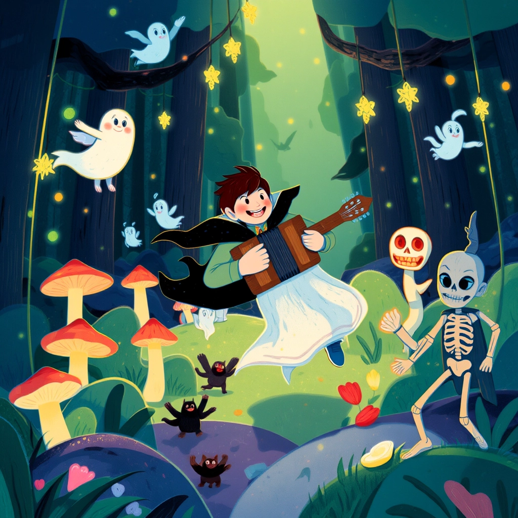 Deep in the forest, [Hobart](9QWXXFTB) heard cheerful music. Following the sound, he stumbled upon a magical party—bats, ghosts, werewolves, and even a skeleton grooving to the music of a lone accordion-playing ghost!