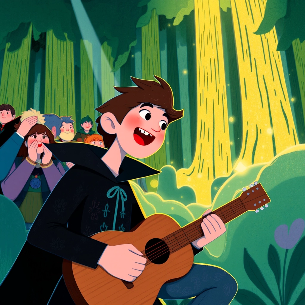 [Hobart](9QWXXFTB)'s heart raced with excitement. Tuning his guitar, he joined the band of magical creatures. His first chord silenced the crowd, but soon they erupted in cheers as he played an enchanting melody under the starry sky.