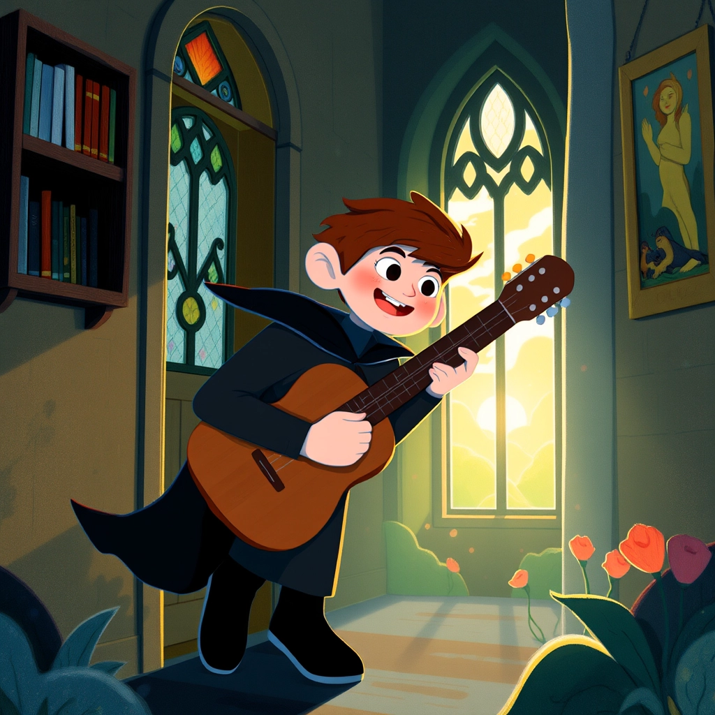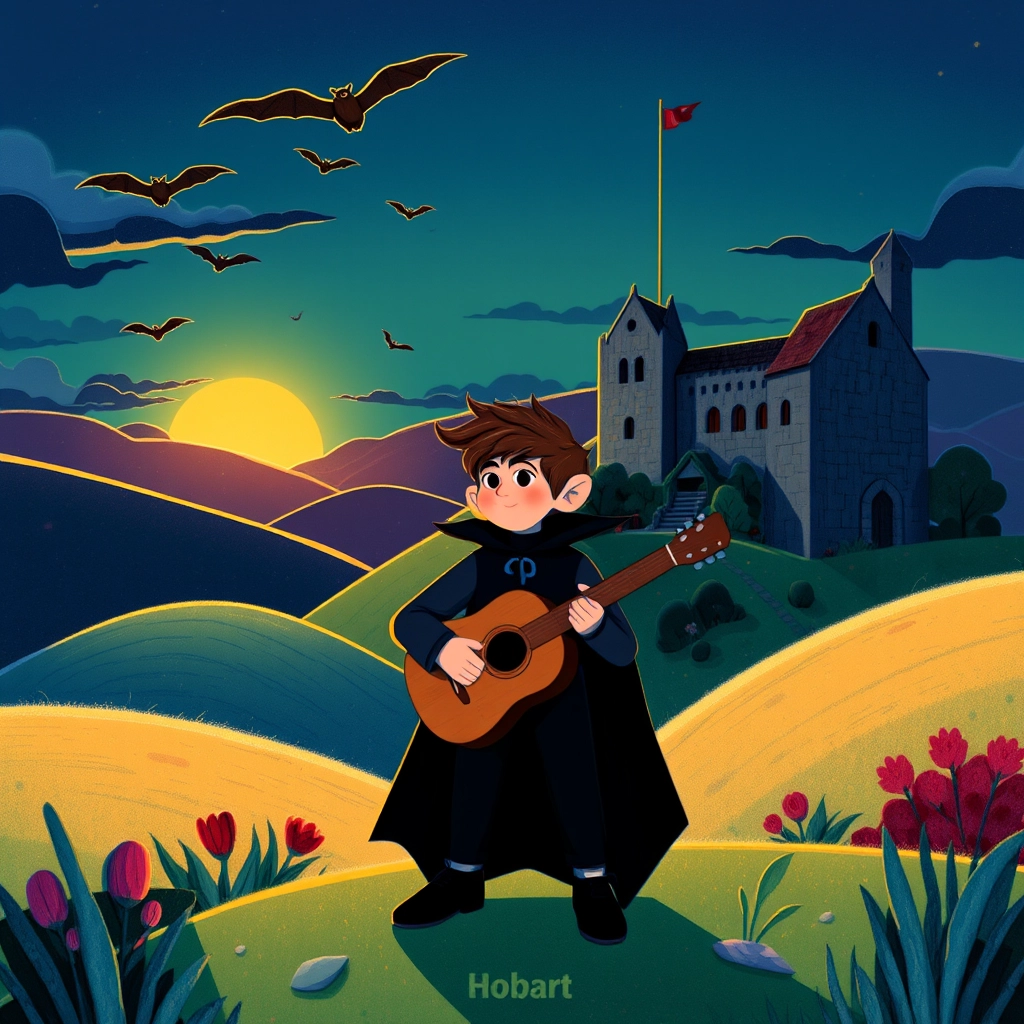 In the land of Transylvania, where twilight painted the sky crimson and shadows danced, there lived an 8-year-old boy named [Hobart](9QWXXFTB). With his short, spiked brown hair and a vampire costume complete with cape and fangs, [Hobart](9QWXXFTB) loved music more than anything. His favorite possession? A guitar he carried everywhere, especially on his many adventures.