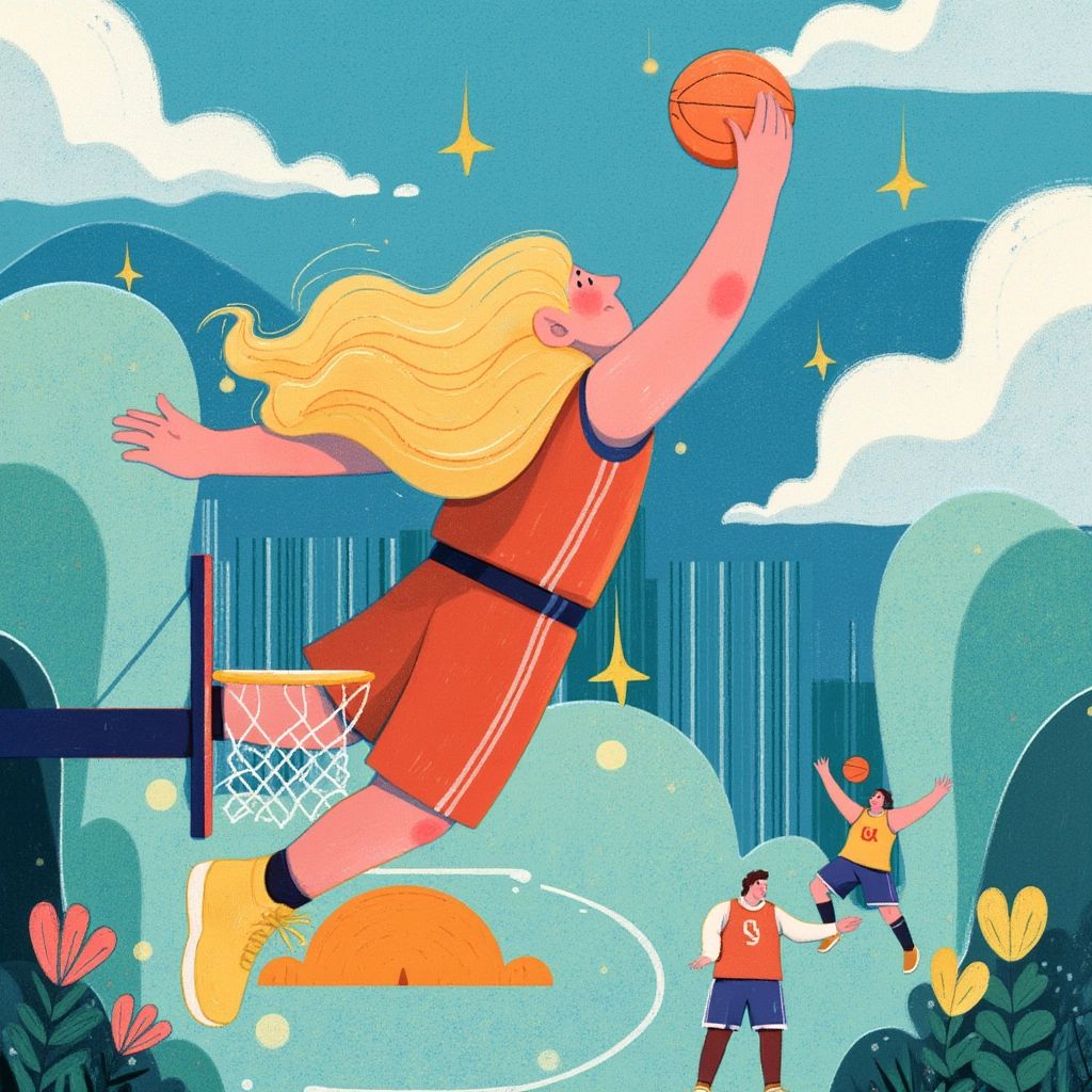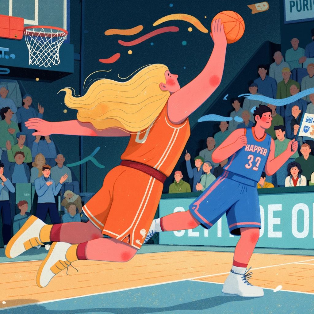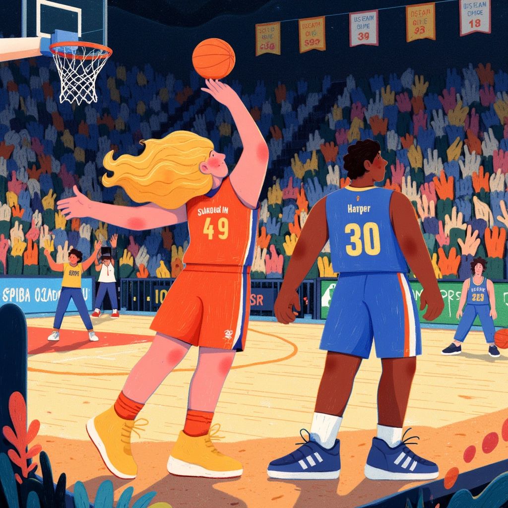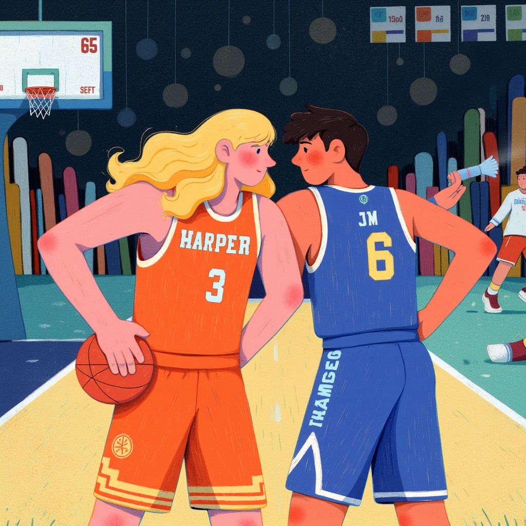 Once upon a time, in the heart of a bustling city, two basketball stars were preparing for the most important game of their lives. [Harper](9S496TP4), with his golden locks and thunderous dunks, was known for his incredible skill on the court. Beside him stood [Jimmy Jim](W6X79GP9), tall and unbeatable, with a determination that could move mountains.
