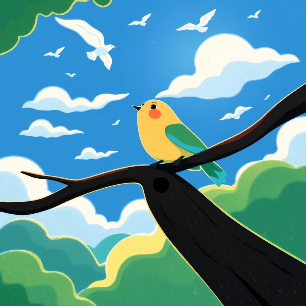 [Hoppity](2TNGP6RM) loved hopping from branch to branch, but she had never dared to fly far from her tree. One morning, she gazed up at the skies and thought, 'Maybe today is the day for an adventure.'