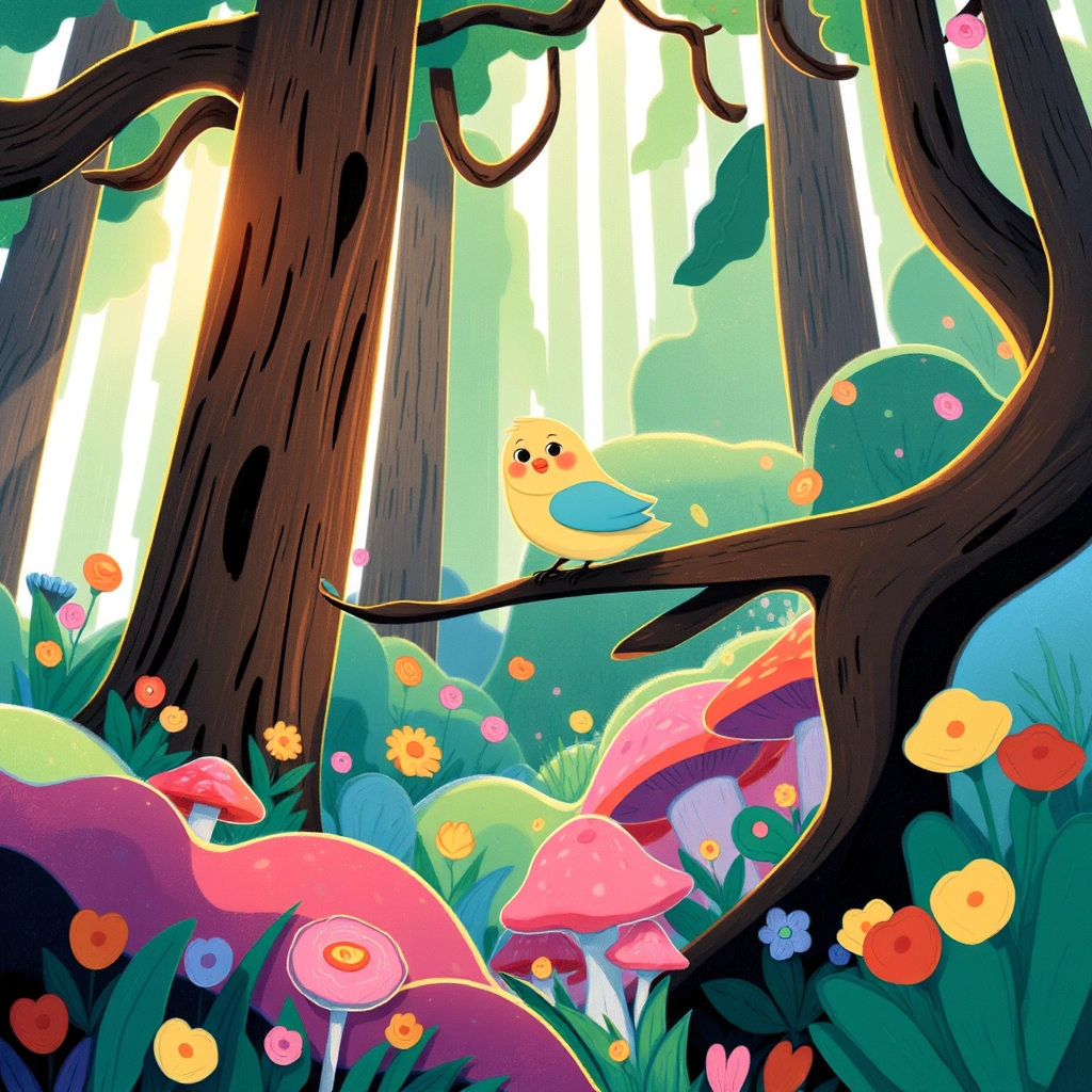 Once upon a time, in a lively and colorful forest, there lived a tiny bird named [Hoppity](2TNGP6RM). [Hoppity](2TNGP6RM) had soft, bright yellow feathers with touches of turquoise on her wingtips and the most curious little black eyes.