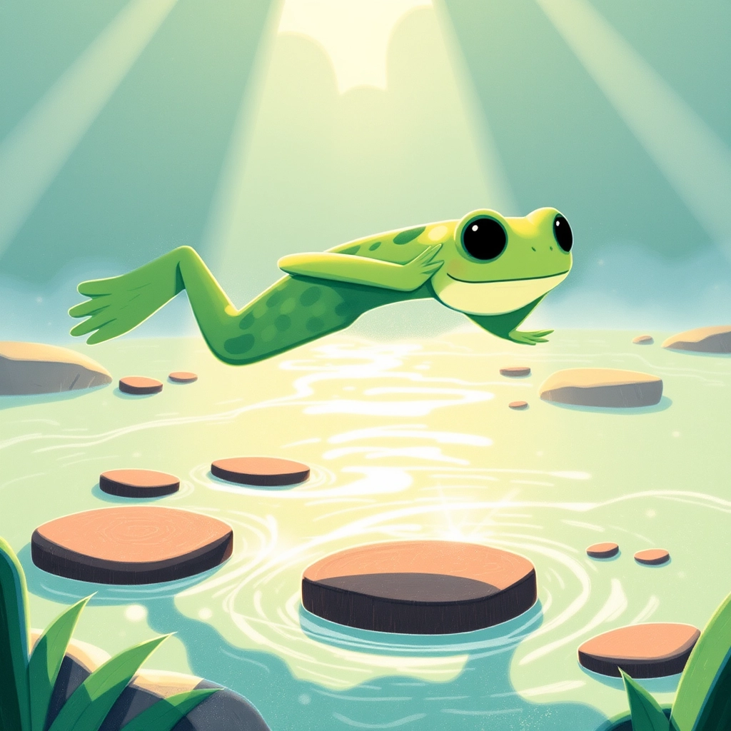 The frog introduced himself as [Hopper](9N7BV7VR). 'I can hop across and find stepping stones for you,' he said. And with a mighty leap, he hopped away, his shiny green body twinkling in the sun.