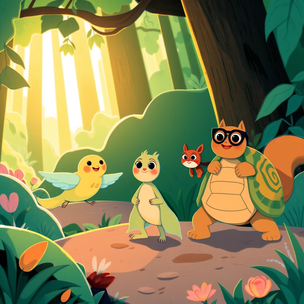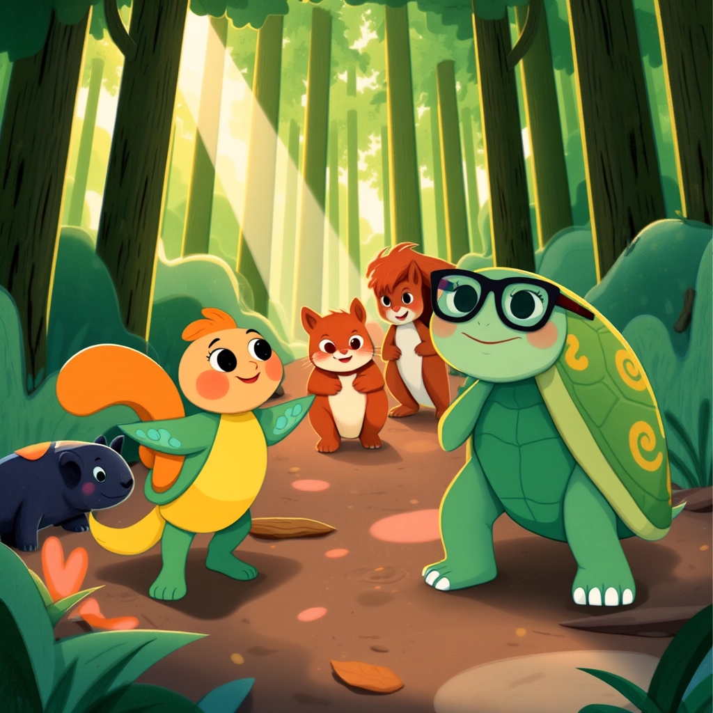As they traveled, they met an unusual turtle named [Speedy](WR6P9VFF). [Speedy](WR6P9VFF) had a vibrant green shell with orange patterns that gleamed in the sunlight and wore tiny glasses that perched on his beak.