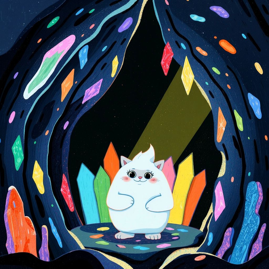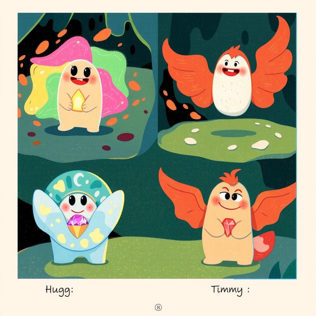 Inside the cave, they discovered glowing crystals of every color imaginable. [Hugg](M45R3ZJ5) realized these crystals could spread kindness and joy when hugged.