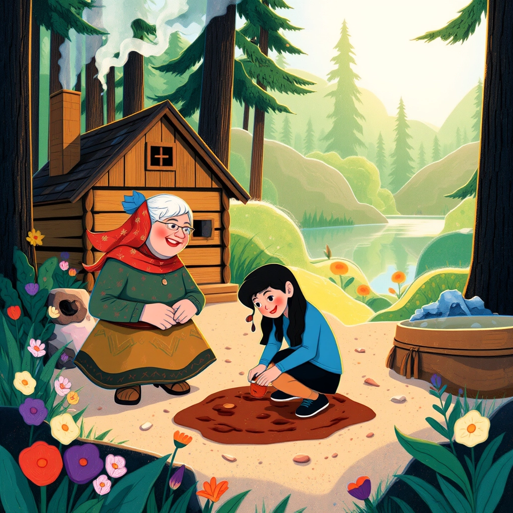 [Ikwesis](H2YXKPQK) lived in a rustic little cabin with her [Kokom](5JB6S5RH), surrounded by a lush forest and a calm lake. The sun was shining brightly one hot summer day as she played outside, making her favorite mud pies in the sand.