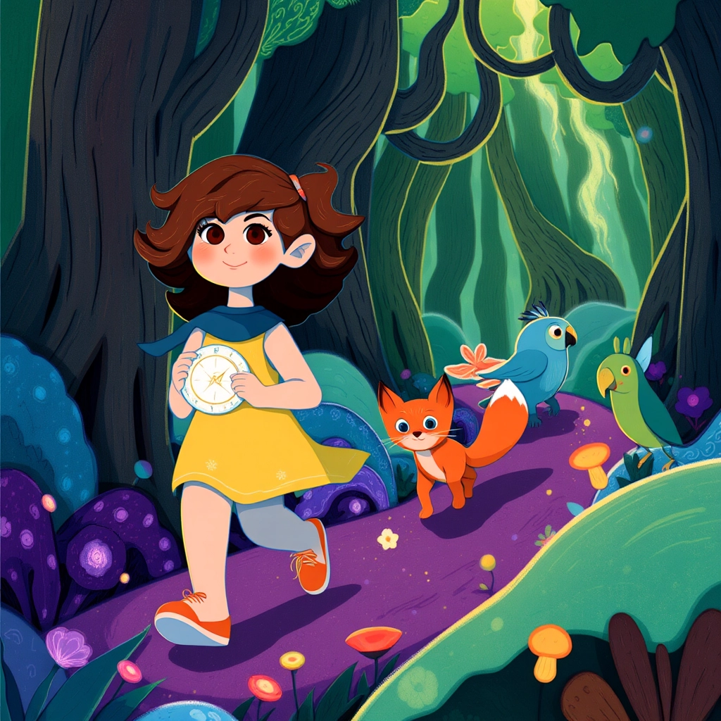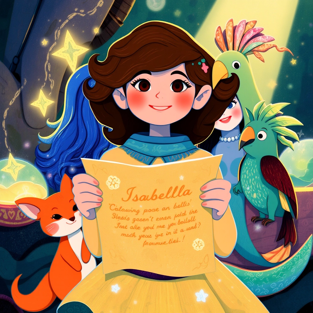In the forest, [Isabella](VK4GHXCL) met [Blinko](SJXTKW22), a tiny orange fox with shiny fur and sparkling eyes. He wore a little blue scarf and promised to guide her to safety.