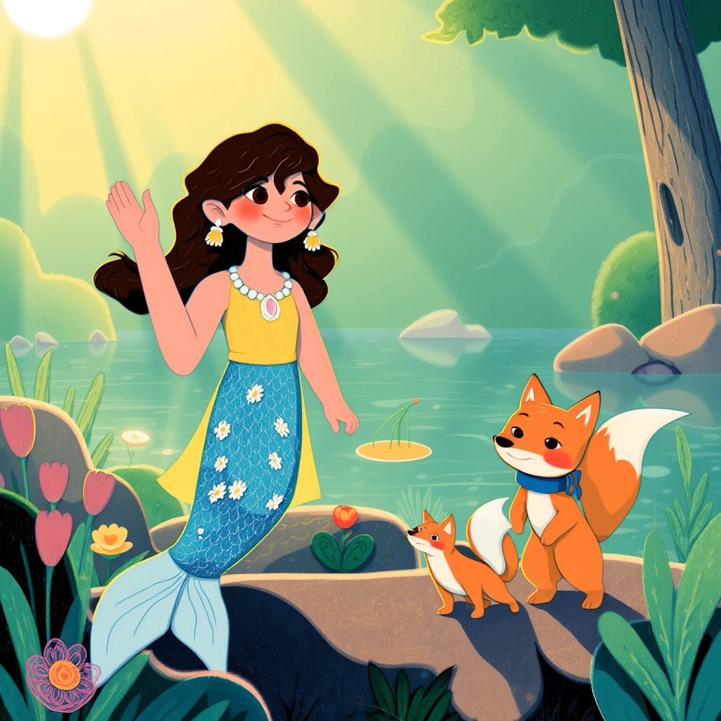 [Blinko](SJXTKW22) led [Isabella](VK4GHXCL) to a shimmering river where they met [Coralie](RYHYYW43), a blue-scaled mermaid with long flowing hair and seashell jewelry. She offered to help them cross the river.