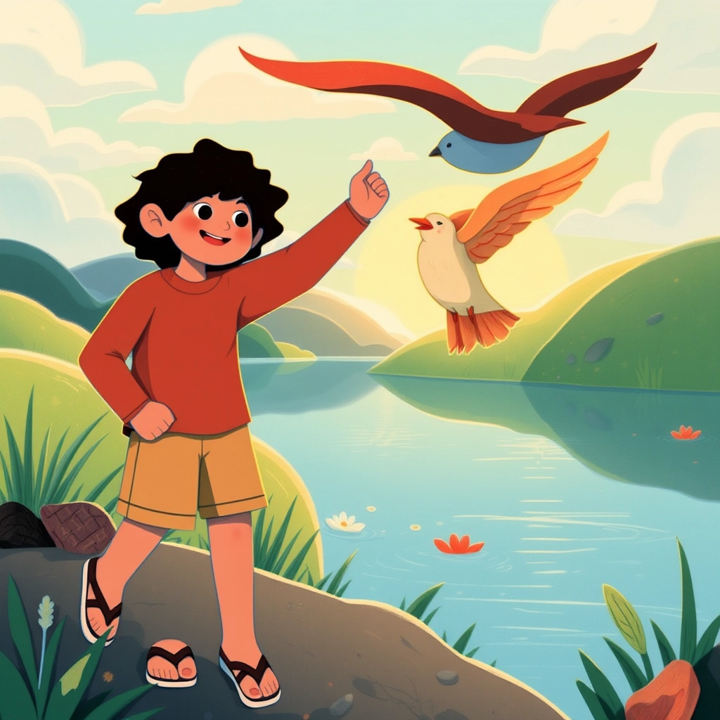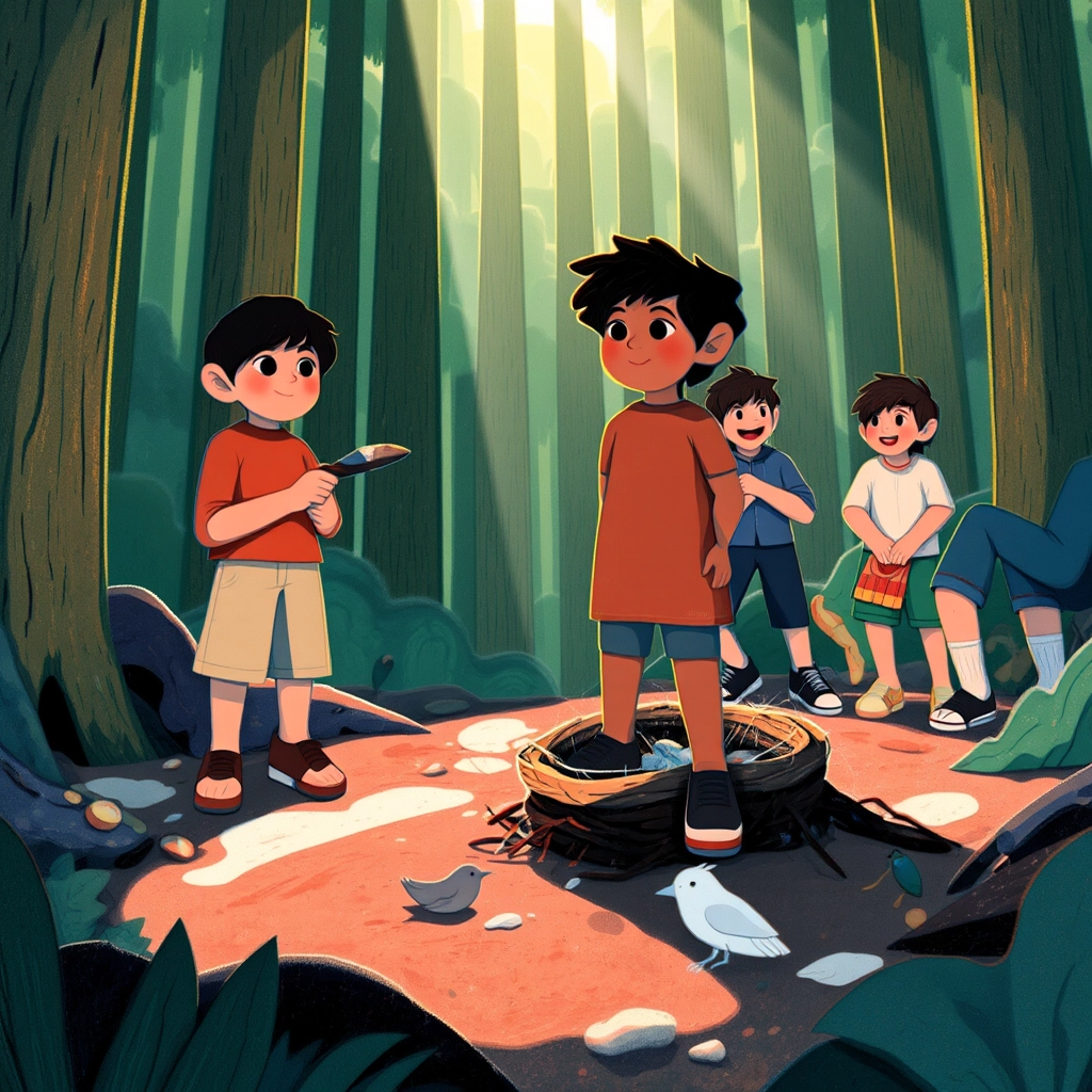 The older boys dared [Ismael](9KTNKP3P) to throw stones at birds. Though hesitant, he didn’t want to seem afraid, so he joined them. A stone hit a nest, and a baby bird fell to the ground. [Ismael](9KTNKP3P) froze, filled with regret.