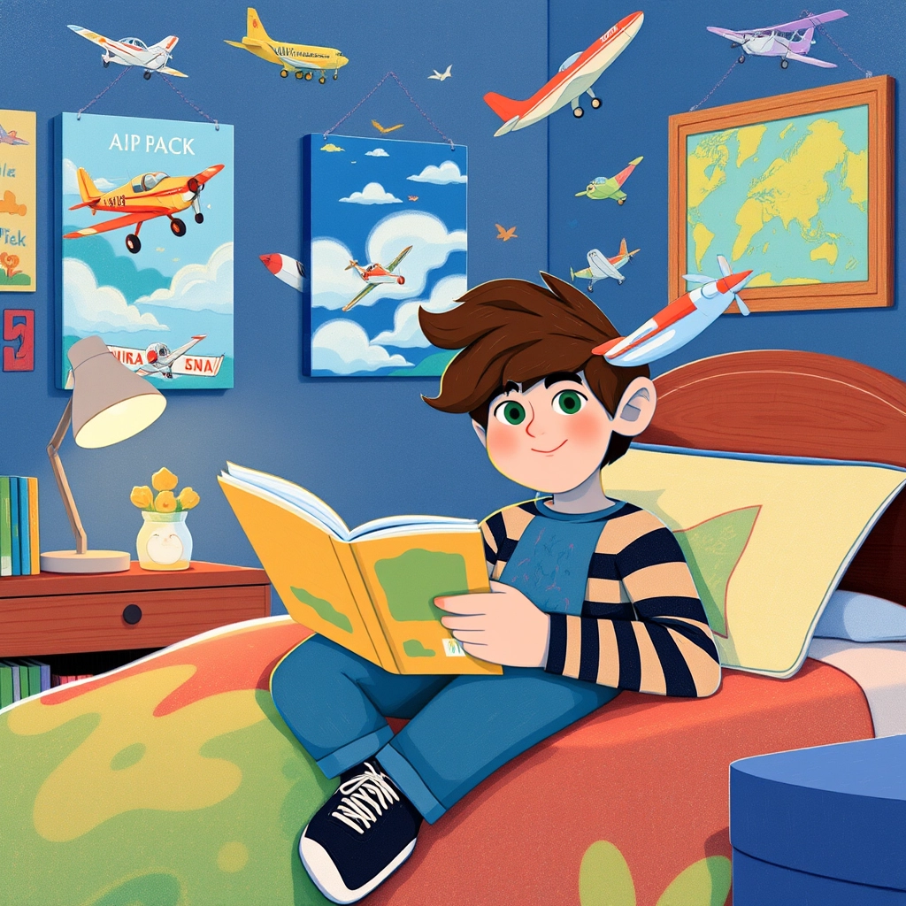 [Jack](TH9RV65Z) loved airplanes. His bedroom walls were covered with posters of jets, and his bookshelves were full of stories about daring pilots. He always dreamed of flying one himself!