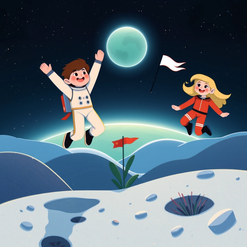 Outside, the moon was even cooler than they imagined. [Jake](P72N3ZGK) laughed as he bounced up high in the low gravity, and [Stacy](2W69KC4T) joined him, twirling and jumping like astronauts in training.