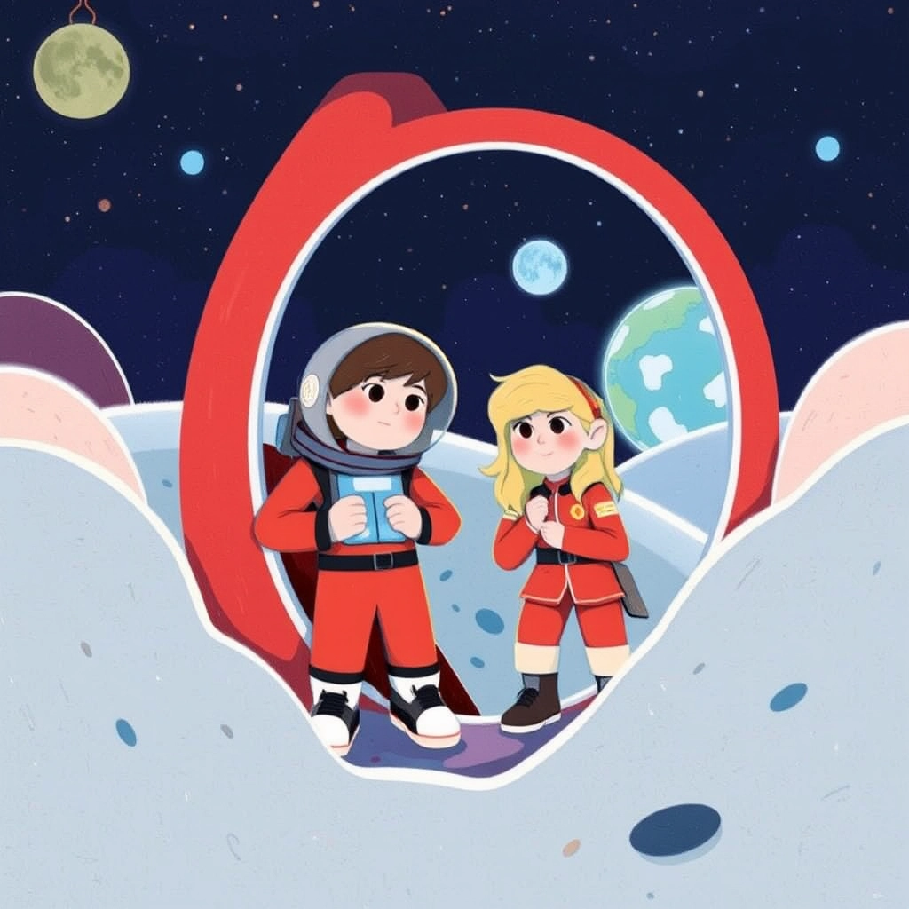 The rocket landed softly on the moon's surface. [Jake](P72N3ZGK) couldn't wait to explore! They put on their suits and helmets, and [Stacy](2W69KC4T) helped [Jake](P72N3ZGK) zip up his boots before heading outside.
