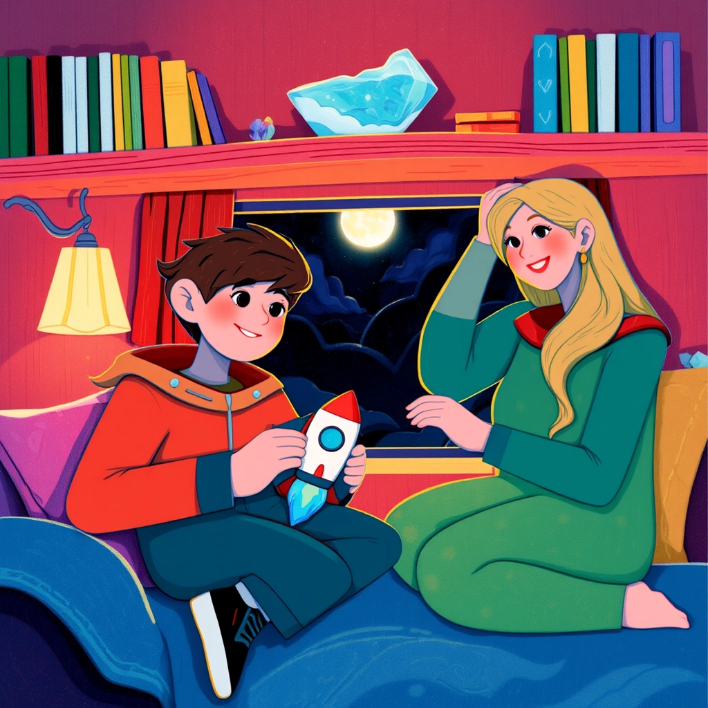 Back home, they placed their moon crystals on their bedroom shelf as a memory of their moon adventure. 'The moon really is amazing,' [Jake](P72N3ZGK) said, and [Stacy](2W69KC4T) smiled. 'And so are you, little brother.'