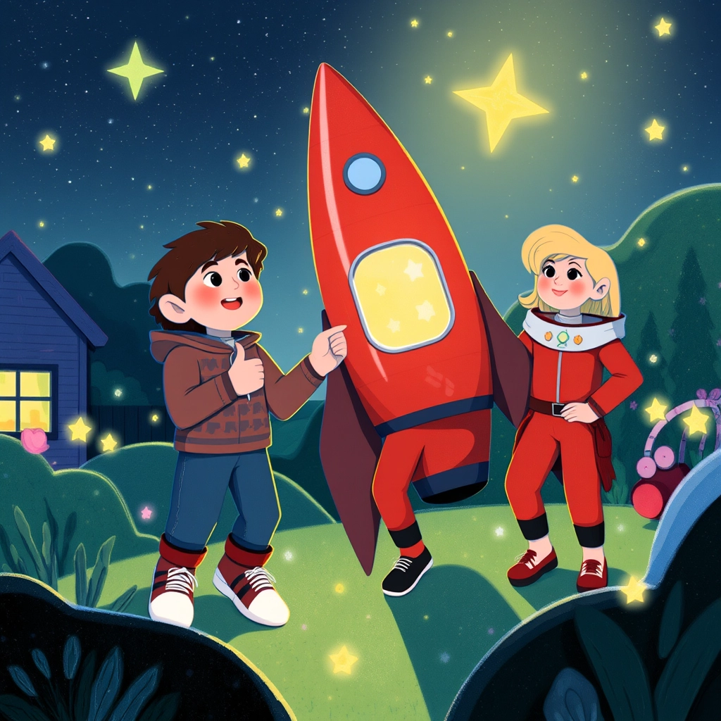 A magical shooting star whizzed by. [Stacy](2W69KC4T) whispered, 'Make a wish!' [Jake](P72N3ZGK) closed his eyes tightly, made his wish, and opened them to find a surprise — a shiny red rocket ship stood in their backyard!