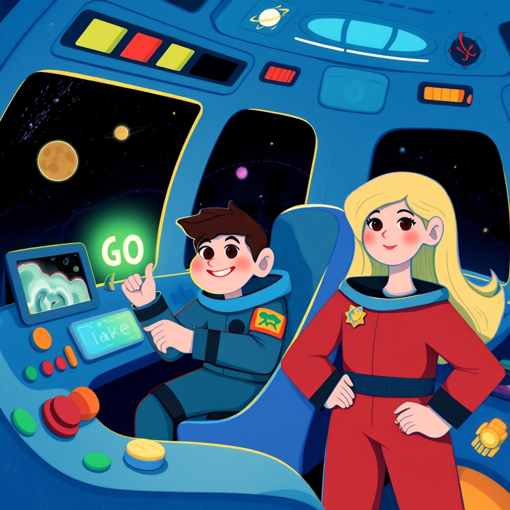 They climbed aboard, with [Stacy](2W69KC4T) leading the way. Inside, the rocket ship's dashboard was full of glowing buttons and screens showing stars and planets. [Jake](P72N3ZGK) pushed the big green 'GO' button!
