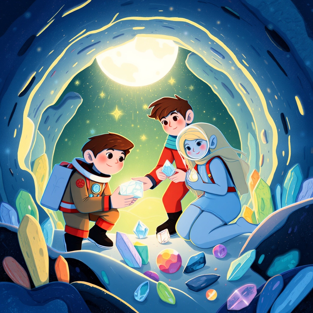 The alien, whose name was [Lumio](2QYG9RG4), showed them secret moon craters filled with crystals. [Jake](P72N3ZGK) collected a shiny blue one, and [Stacy](2W69KC4T) took a sparkling white one. 'These are for good luck,' said [Lumio](2QYG9RG4).
