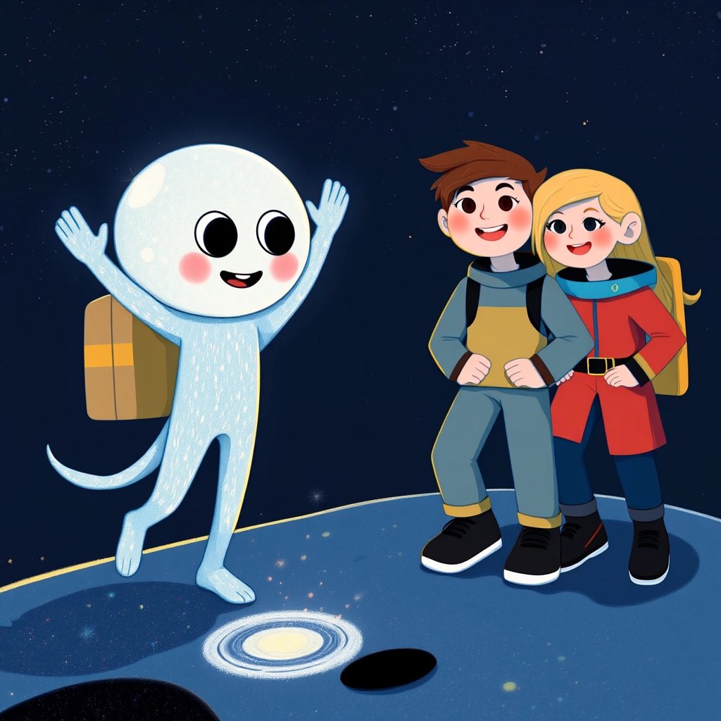 Suddenly, they spotted a strange figure hopping towards them. It was a friendly moon alien with three eyes and skin that shimmered like stardust. 'Welcome to the moon!' it said with a glowing smile.